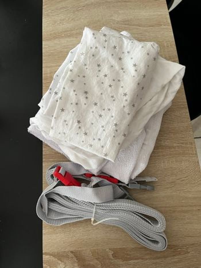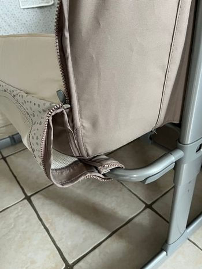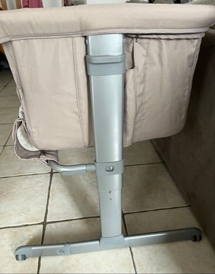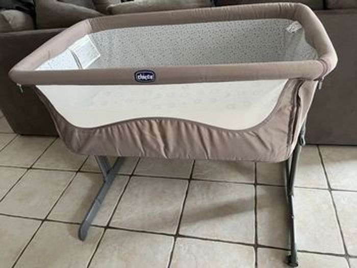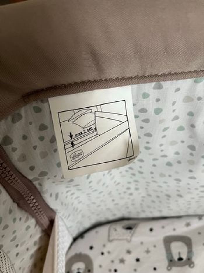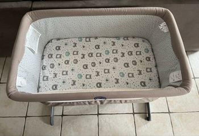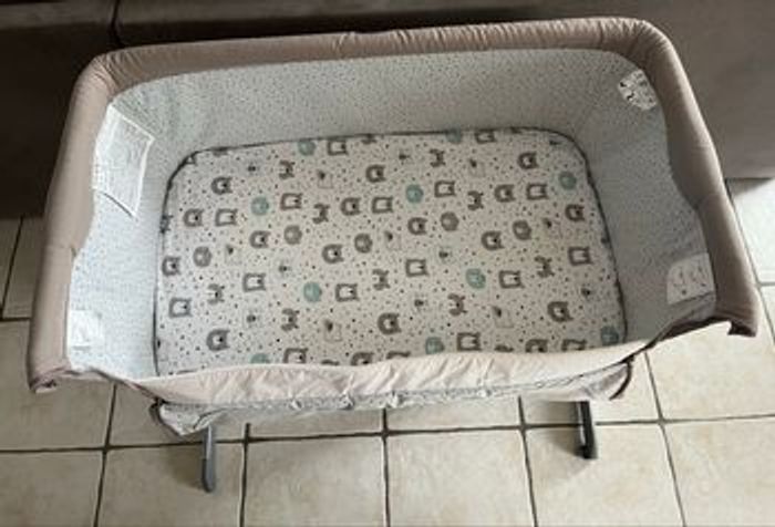 De Om a 6m / 9kg Dimensions: 98.5 × 70.5 × 65/80 cmcm Il a 6 niveaux de hauteur et des pieds pliants. Possibilité de basculer le cododo sur 2 niveaux différent pour surélever le bébé quand il est malade ou qu'il régurgite. 2 roues avec freins pour le déplacer facilement. Le tissu est amovible. Kit ceintures. Il a un sac de protection transportable. Une petite tache voir photo. Matelas avec 3 alèses et 4 draps housses. En très bon état utilisé 5 mois. À venir chercher aux alentours de Montaigu-Vendée