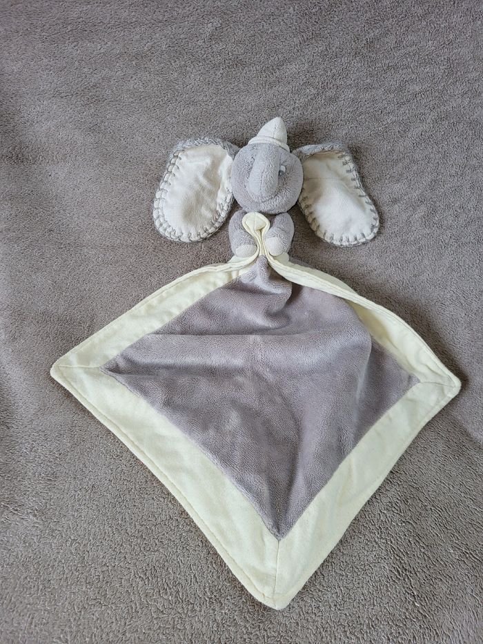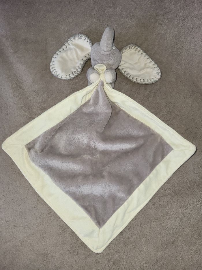 Doudou plat Éléphant Dumbo Nicotoy Disney Peluche éléphant en velours gris qui tient entre ses pattes un mouchoir, d'environ 29cm, en velours gris tout doux, le contour est en tissu crème (ce dernier présente de petites bouloches) Intérieur des oreilles et bonnet en velours daim crème #virgy61joueteveil #virgy61puericulture