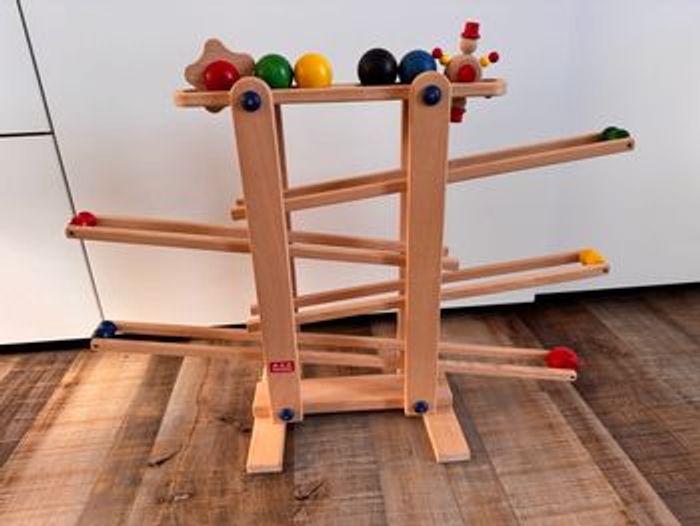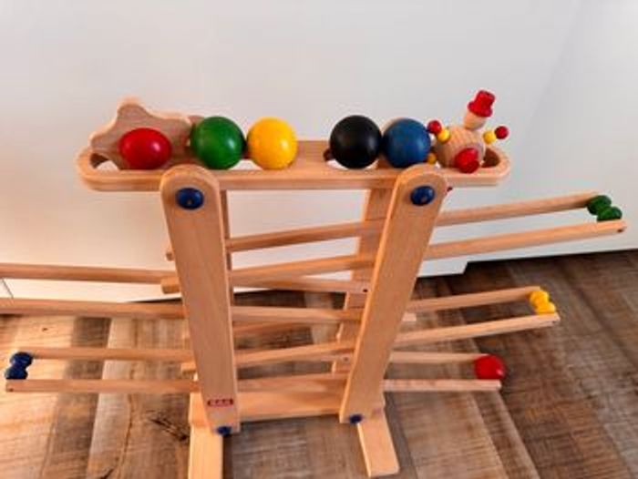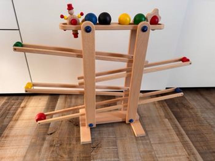 Circuit avec des boules qui descendent Complet 4 boules ( vert noir bleu jeune) 1 rouge avec entourage et un bonhomme Excellent état Montessori Marque trihorse
