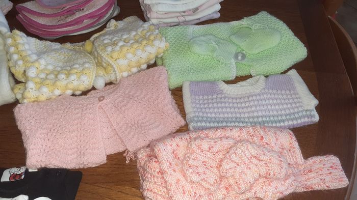 9 pyjamas, 6 bodies, 1j jogging, 6 bavoirs, 2 Tee-shirt, 4 paires de chaussettes, 1 collant, 2 bonnets, 2 paires de gants,5 layette tricoté mains, et 1 nid d ange.