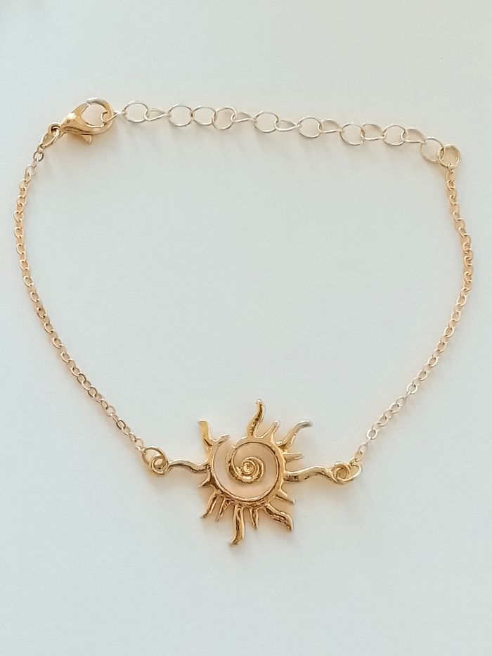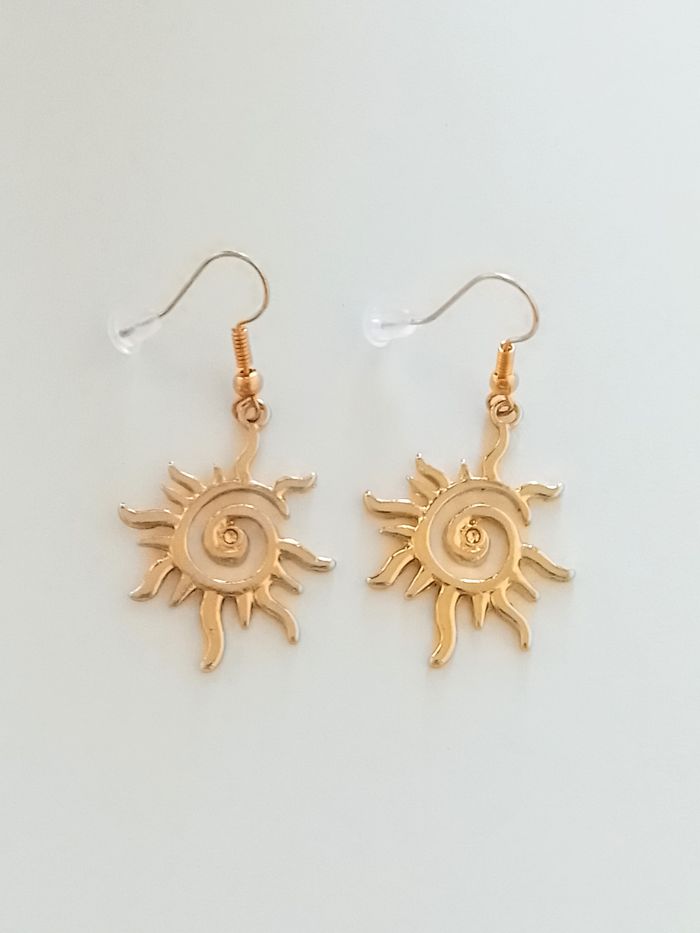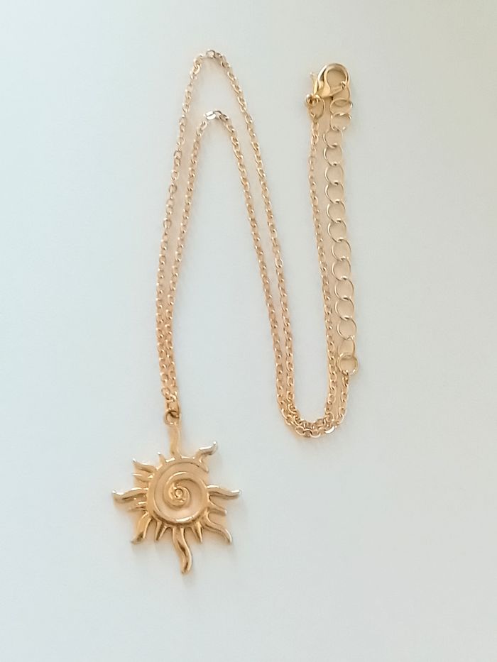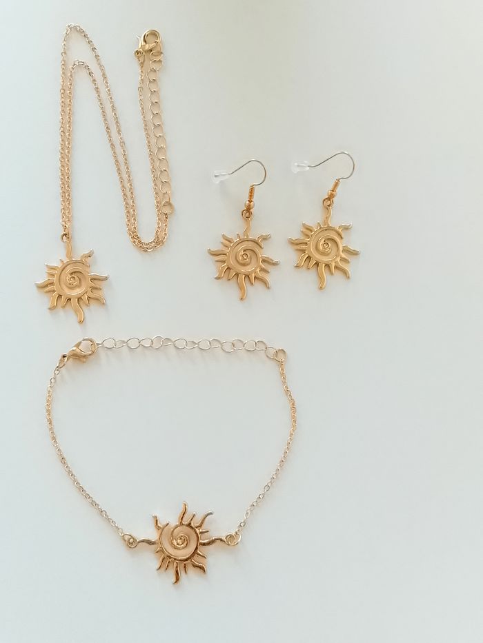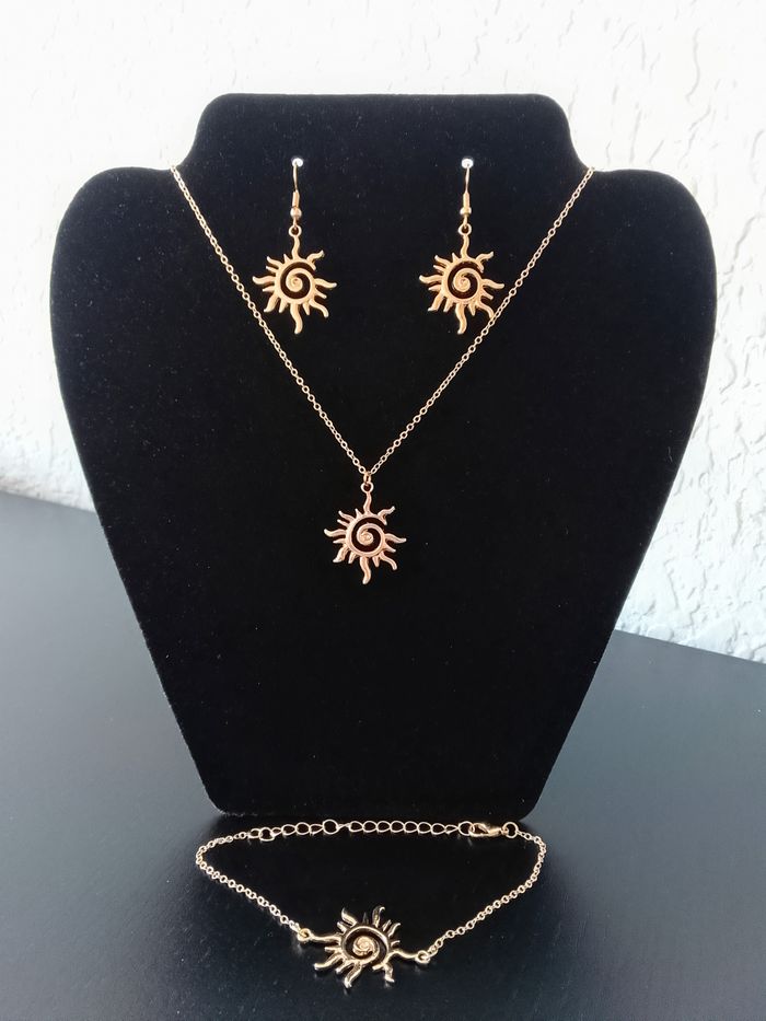 Parure bohème. Parure : chaîne, pendentif + boucles d’oreilles + bracelet soleil. (bohème, boho-chic, élégant, idéal cadeau) DESCRIPTIF : Couleur : doré Taille chaîne : 40 cm + 5 cm Diamètre pendentif : 2,5 cm L * 3,2 cm H Diamètre boucles d’oreilles : 2,5 cm L * 4,5 cm H Taille bracelet : 16 cm + 6 cm Envoi rapide et soigné.