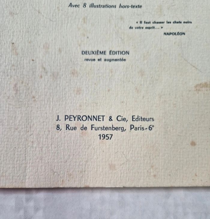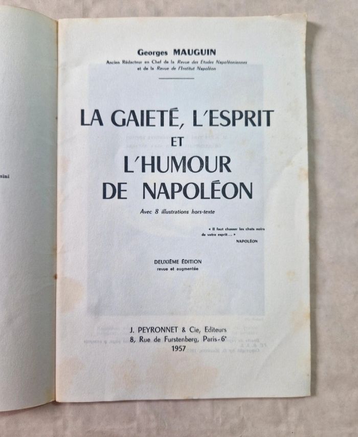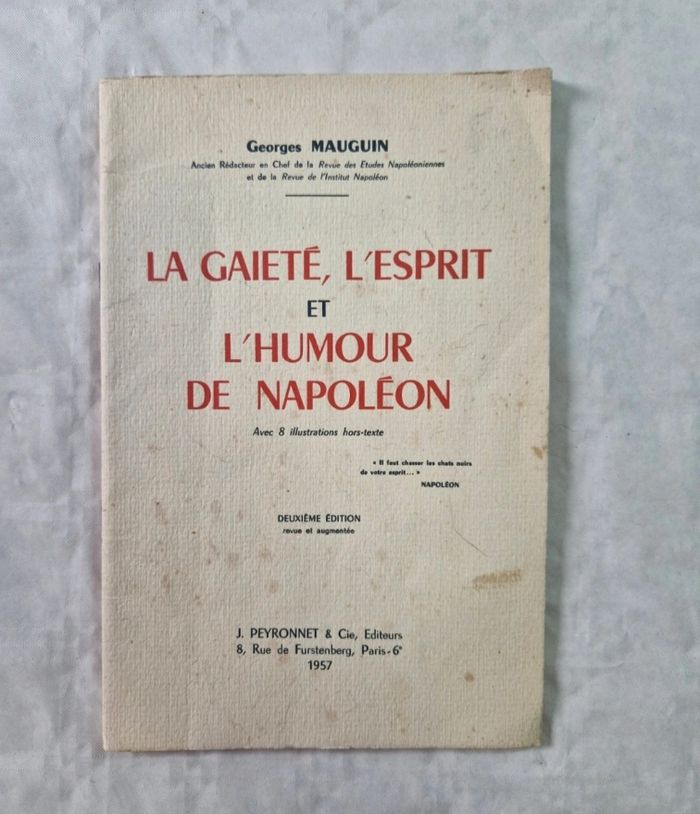 Bonjour ​Livre de Georges Mauguin intitulé "La gaieté, l'esprit et l'humour de Napoléon", publié aux éditions J. Peyronnet & Cie en 1957. Il s'agit de la deuxième édition, revue et augmentée, comprenant 8 illustrations hors-texte. L'auteur était l'ancien rédacteur en chef de la Revue des Études Napoléoniennes. ​Très bon état général. ​L'ouvrage présente quelques rousseurs légères sur la couverture et les tranches dues à l'ancienneté, mais l'intérieur est propre et la reliure est solide. Le dépôt légal date du 1er trimestre 1957. ​ #livre #histoire #napoleon #empire #collection #vintage #1950s #bibliophilie