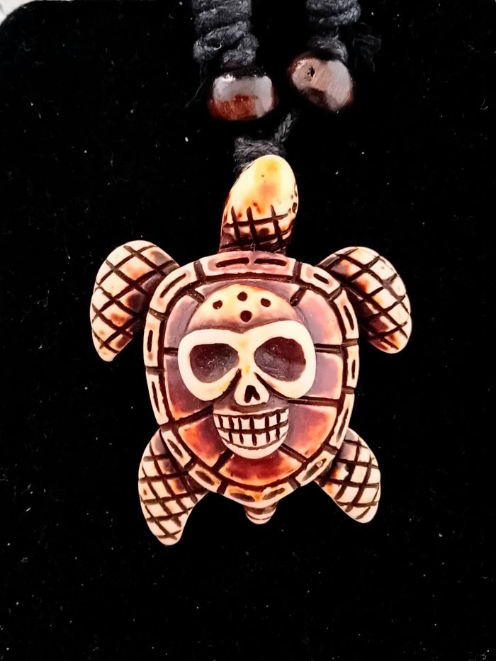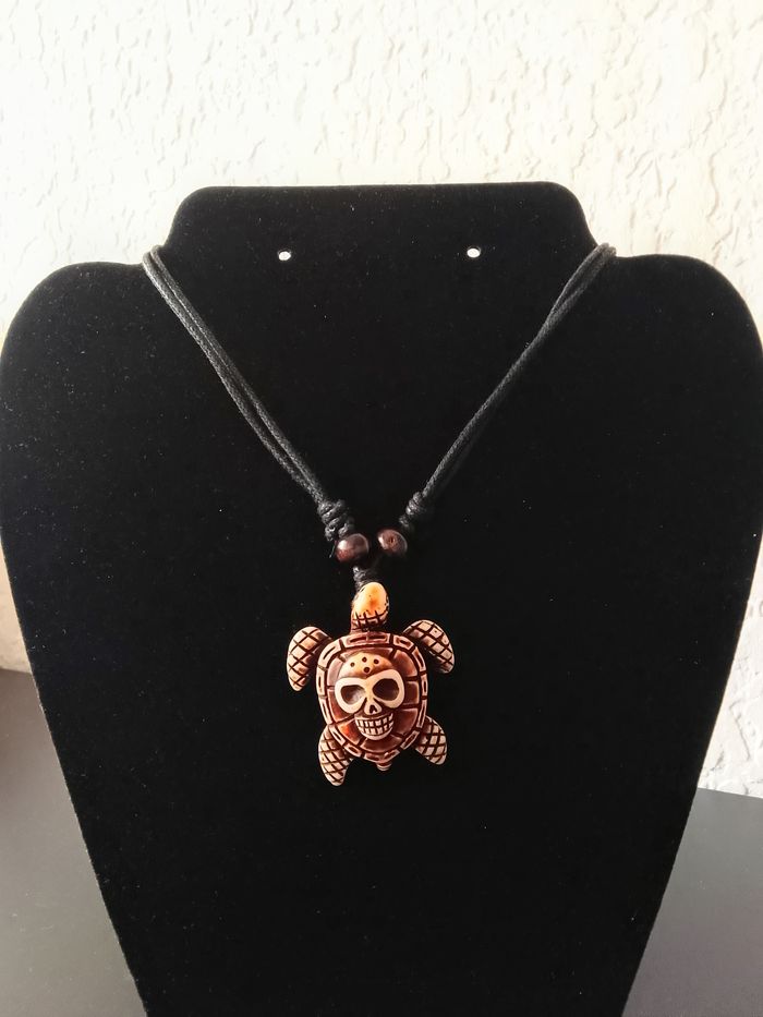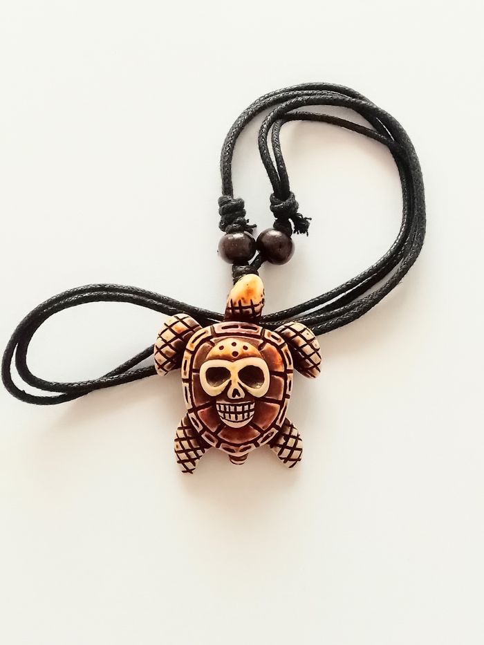 Collier corde réglable, pendentif tortue. Pendentif : tortue, skull. DESCRIPTIF : Couleur : marron. Taille chaîne : 40 cm à 80 cm Diamètre pendentif : 4 cm L* 4,5 cm H Envoi rapide et soigné.