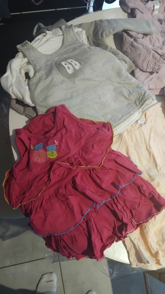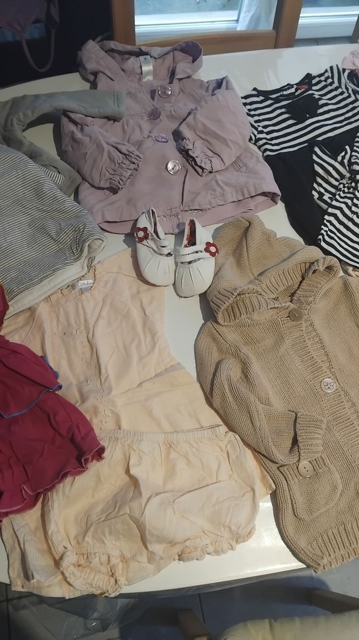 Lot de vêtements bébé fille taille 9 mois comprenant : 2 robes 1 robe avec culotté 1 robe hiver avec tee shirt manche longue et manteau accordé 1 petite veste 1 gilet Chaussures bébé 6-12 mois 4 pantalons 4 tee-shirts manches courtes 1 blouse sans manches 2 tee-shirts manches longues 1 robe avec tee-shirt manches longues 1 short 1 ensemble avec haut legging et fichu 2 bodys manches courtes. Plus de photos si besoin.
