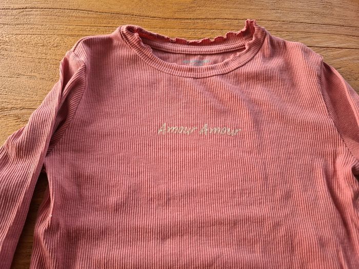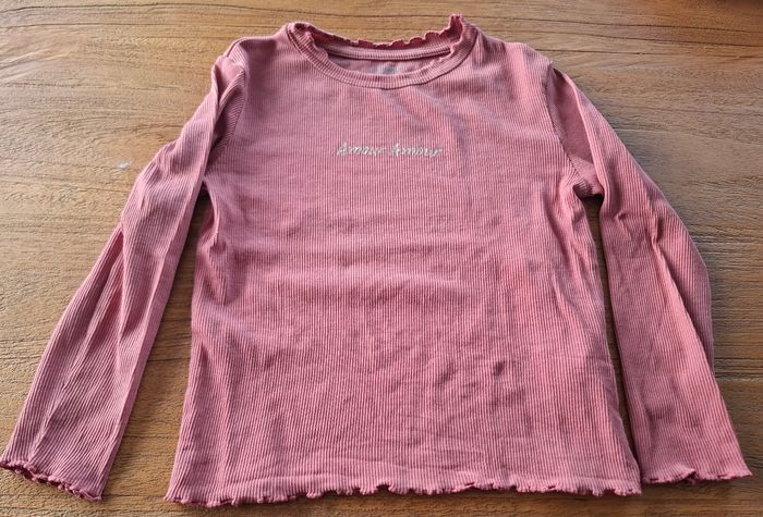 Joli t-shirt manches longues ,vieux rose 💗 Matière côtelée, coupe confortable avec finitions ondulées au col, aux manches et en bas. Petite inscription discrète sur le devant. Parfait pour la mi-saison ou l’hiver sous un gilet 🧥 Taille : 5 ans Couleur : Vieux rose Facile à assortir avec jean, legging ou jupe 👖 Maison non-fumeur. Envoi rapide et soigné 📦