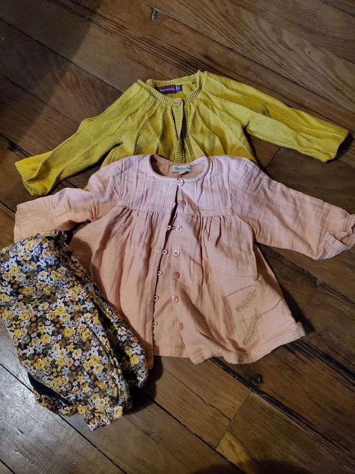 Salopette fleurie et gilet assorti jaune sergent major 68 cm 6 mois. Je donne avec une blouse couleur pêche moulin roti qui se marie super bien avec la tenue . N'hésitez pas à me demander d'autres photos ou me faire part de vos besoin . J'ai peut être ce qu'il vous faut dans mes placards