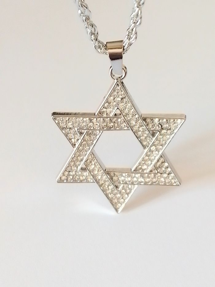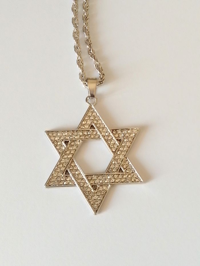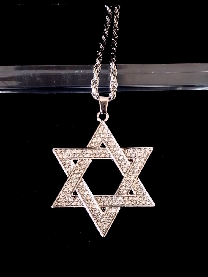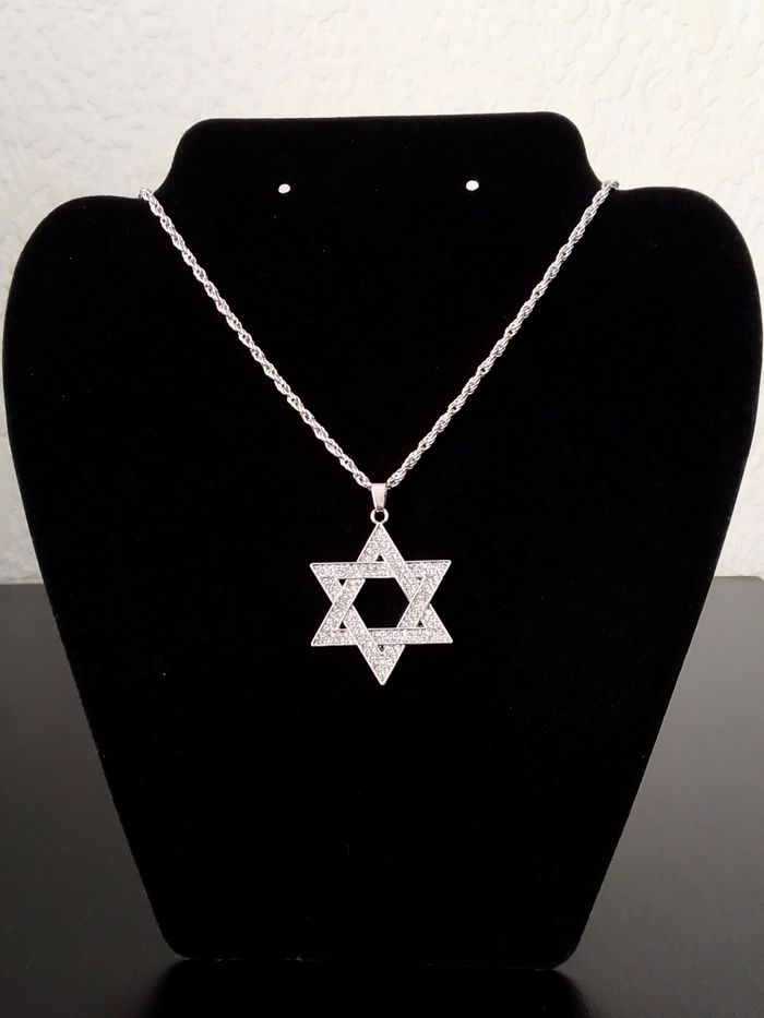 Chaîne + pendentif religieux. Pendentif : hexagramme, strass. (religieux, protection, spirituel, celtique, idéal cadeau) DESCRIPTIF : Couleur : argenté. Taille chaîne épaisse : 60 cm Diamètre pendentif : 3,5 L * 4 cm H Envoi rapide et soigné.