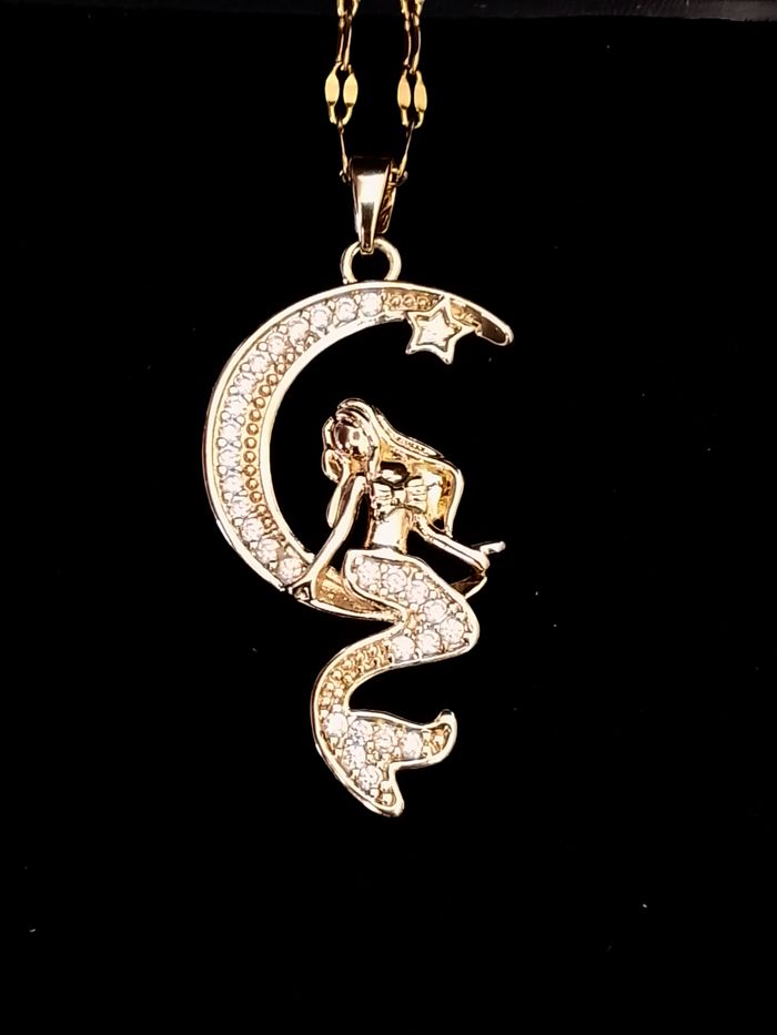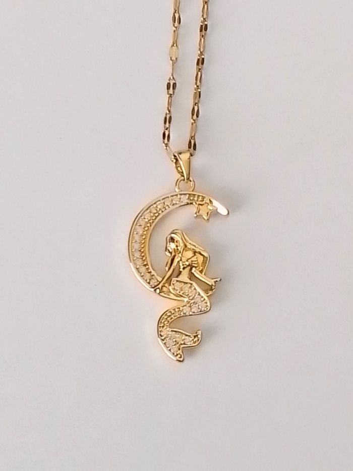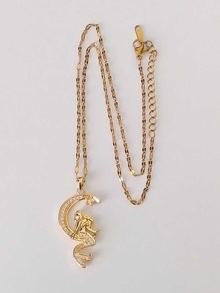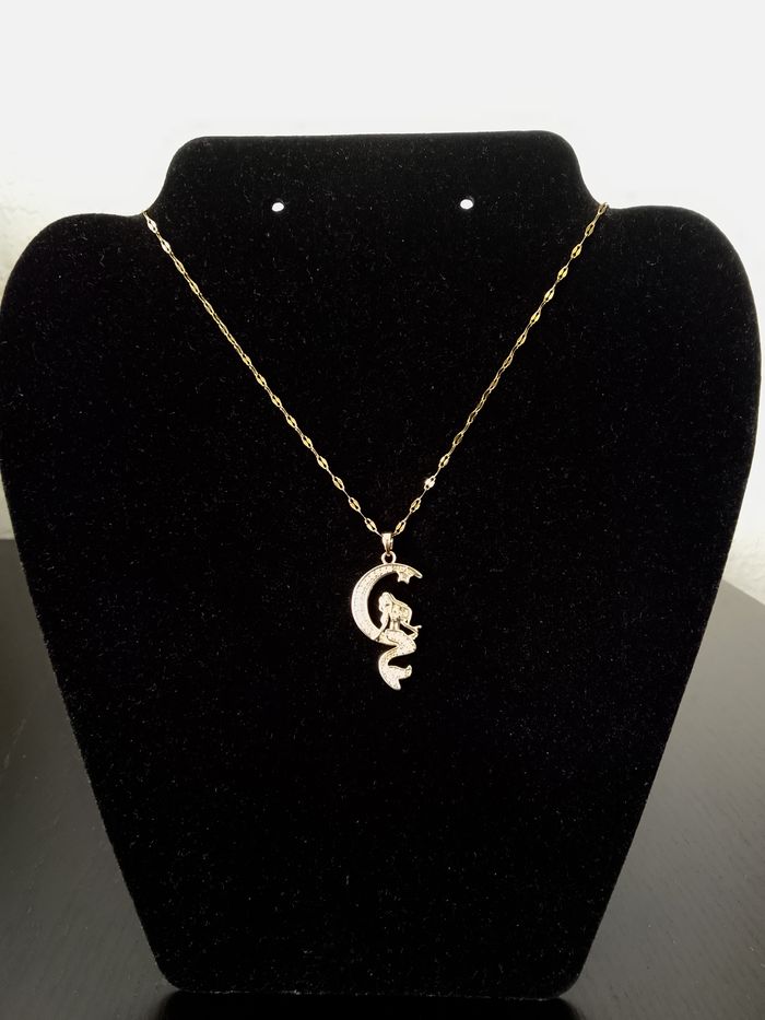 Chaîne + pendentif élégant. Pendentif : croissant lune, sirène, strass. (élégant, bohème, boho-chic, celtique, idéal cadeau) DESCRIPTIF : Couleur : doré. Taille chaîne : 40 cm + 5 cm Diamètre pendentif : 3,5 cm H Envoi rapide et soigné.
