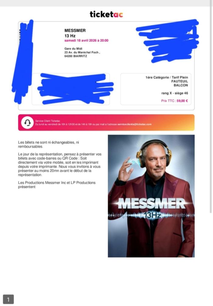 Vend deux places pour messmer a biarrtiz le 28 avril