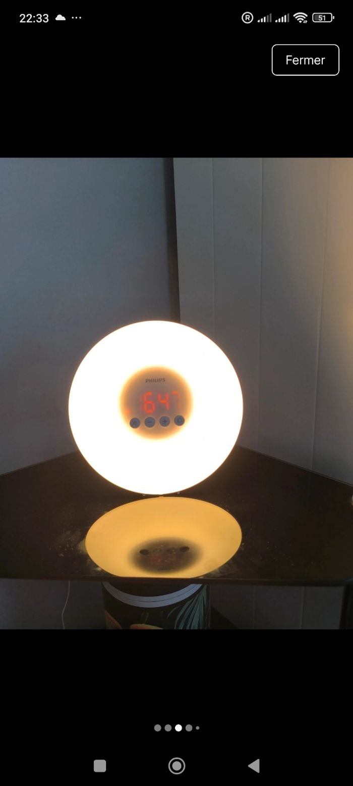 Très bon état . Envoi rapide et soigné. Frais de port Mini. Éveil lumineux. La simulation de lever de soleil vous réveille progressivement Comme lors d'un vrai lever de soleil, la luminosité augmente progressivement pendant 30 minutes, jusqu'à ce qu'un jaune éclatant illumine toute votre chambre. Ce processus de modification et d'intensification progressive de la lumière favorise un réveil naturel. Lorsque la lumière emplit votre chambre, le son naturel que vous avez choisi retentit, pour vous réveiller du bon pied. Lampe de chevet avec 10 réglages d'intensité lumineuse Nous avons tous une sensibilité différente à la lumière. Généralement, le réveil est plus rapide lorsque la luminosité est élevée. Les 10 luminosités différentes de l'Éveil Lumière permettent une personnalisation de la lumière jusqu'à 200 lux.