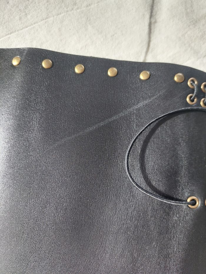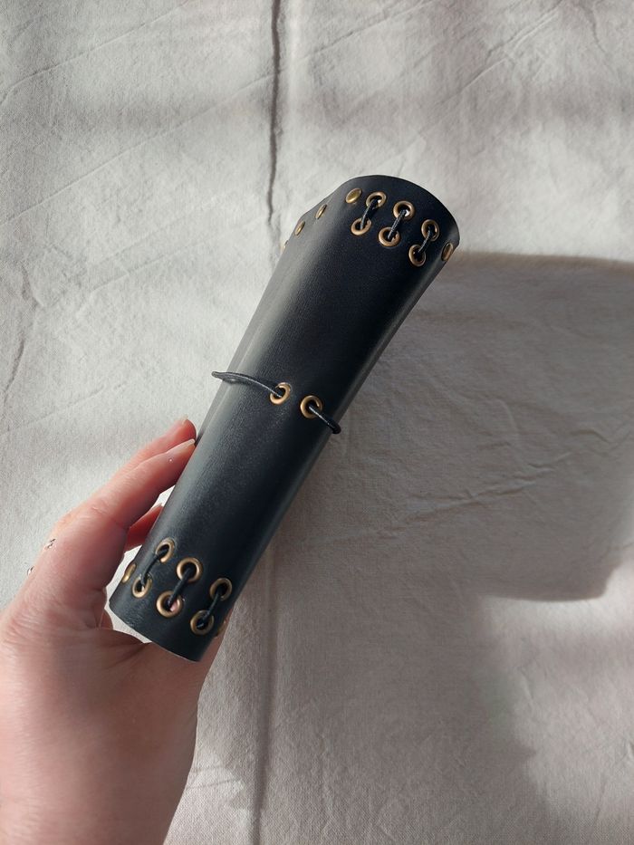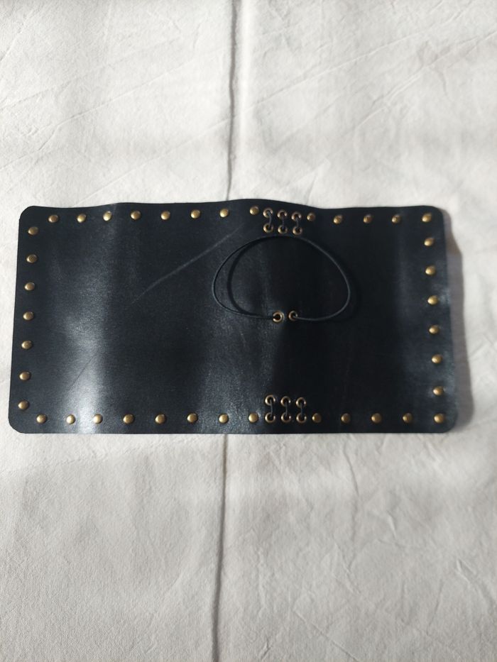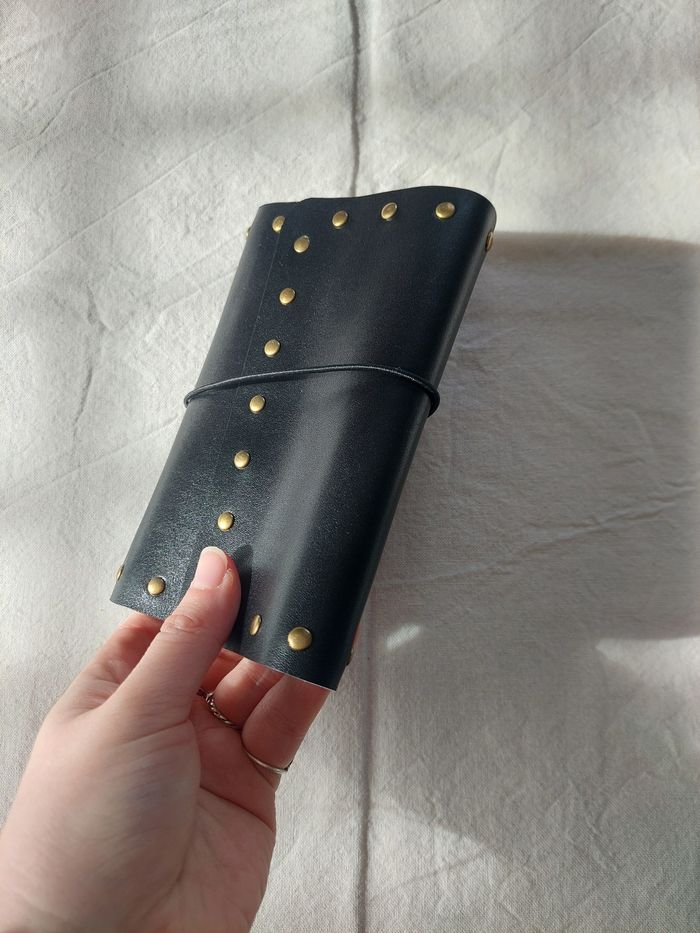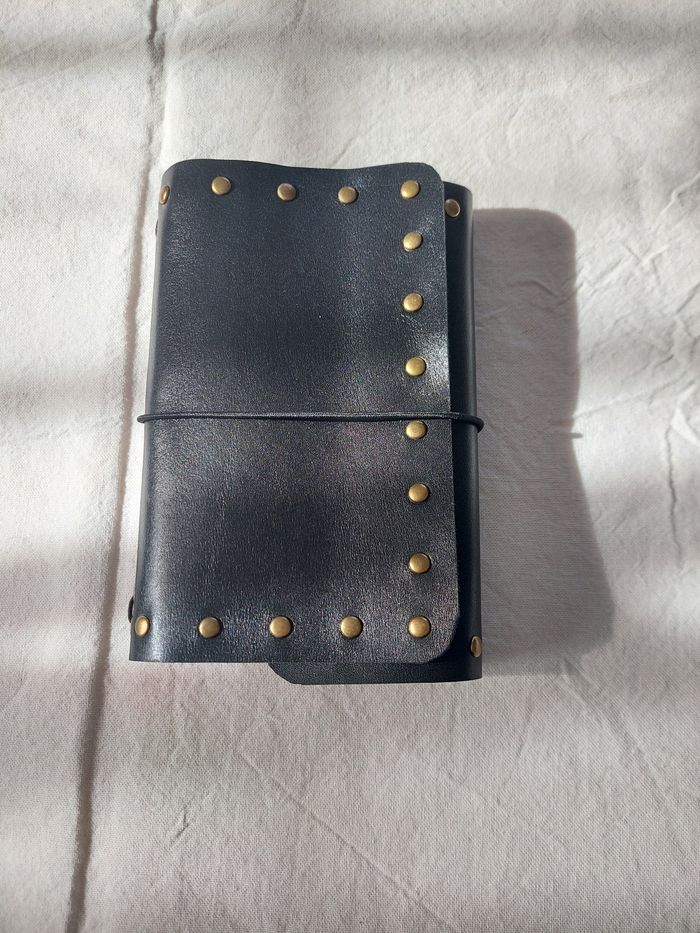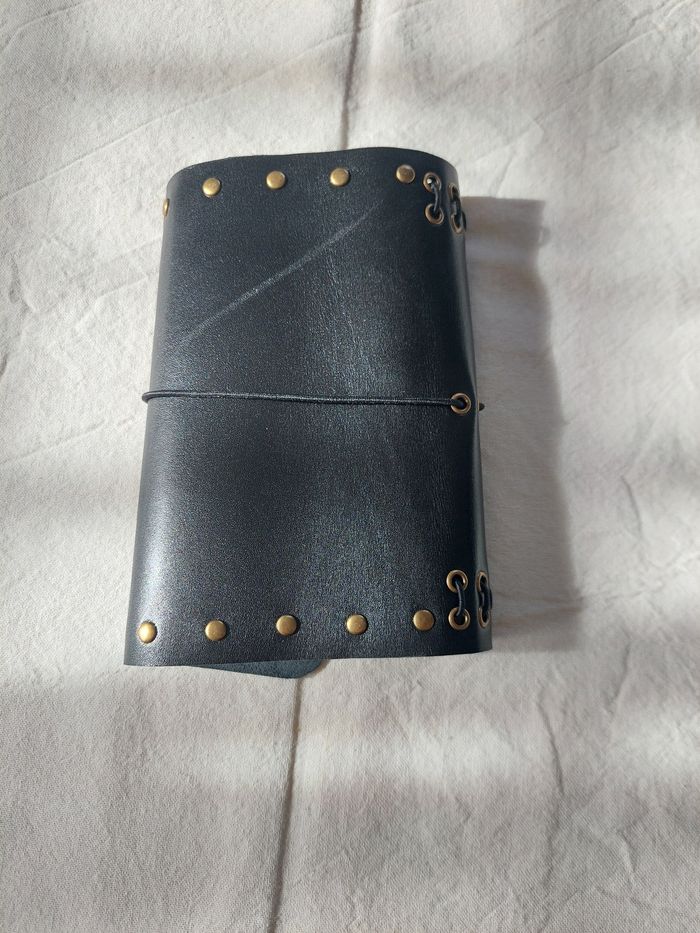 Journal en vrai cuir Format A6, peut contenir jusqu'à 6 carnets, agenda, bullet ou autre grâces aux élastiques En vrai cuir noir, avec élastiques noir et des rivets cuivrés pour un look rock, punk, gothique Deux petits carnets sont inclus dans la commande Neuf, fabrication artisanale L'arrière comporte une marque, visible sur la dernière photo Envoi soigné dans les 48h