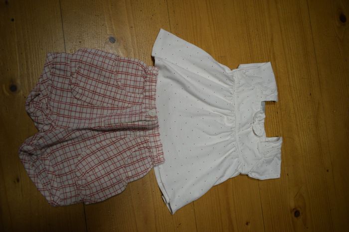 Ensemble short rayé, 2 grande poches. Tunique à pois petit noeud . ensemble rouge et blanc.