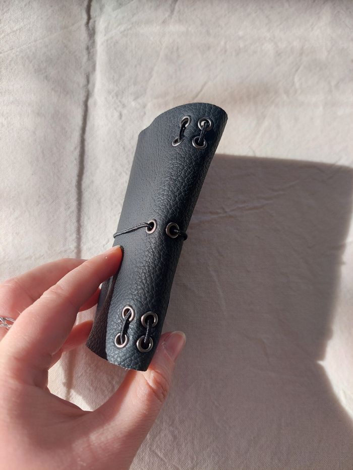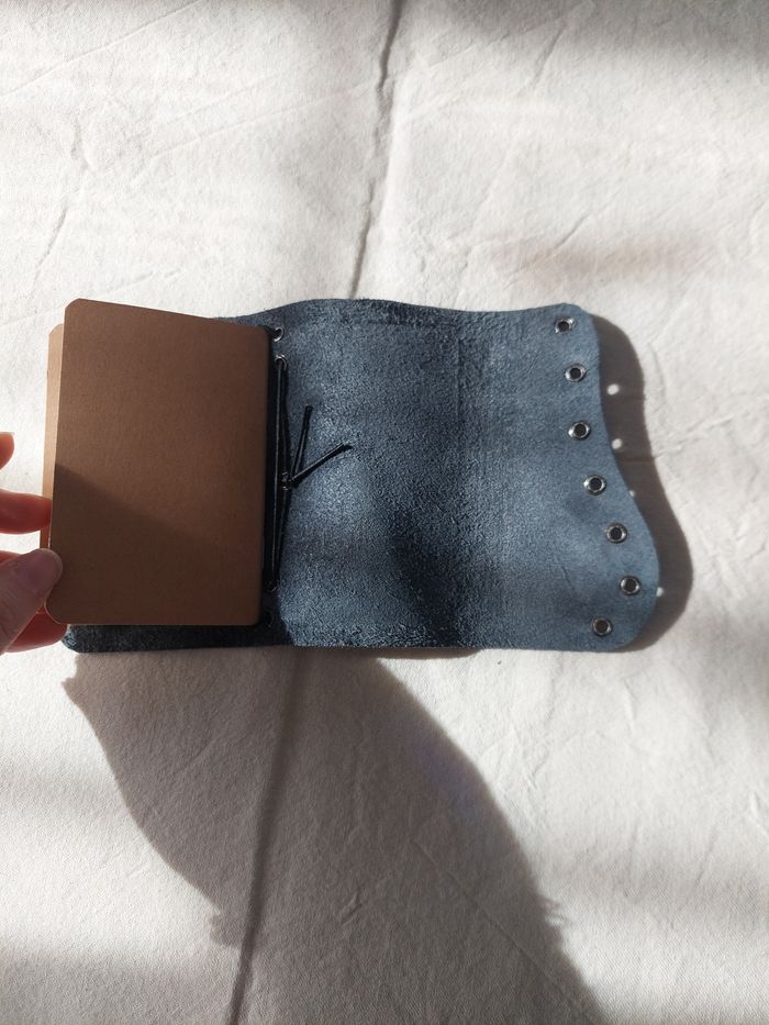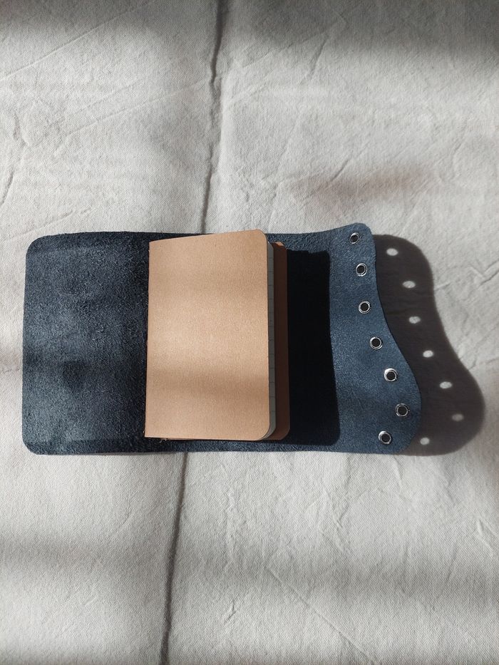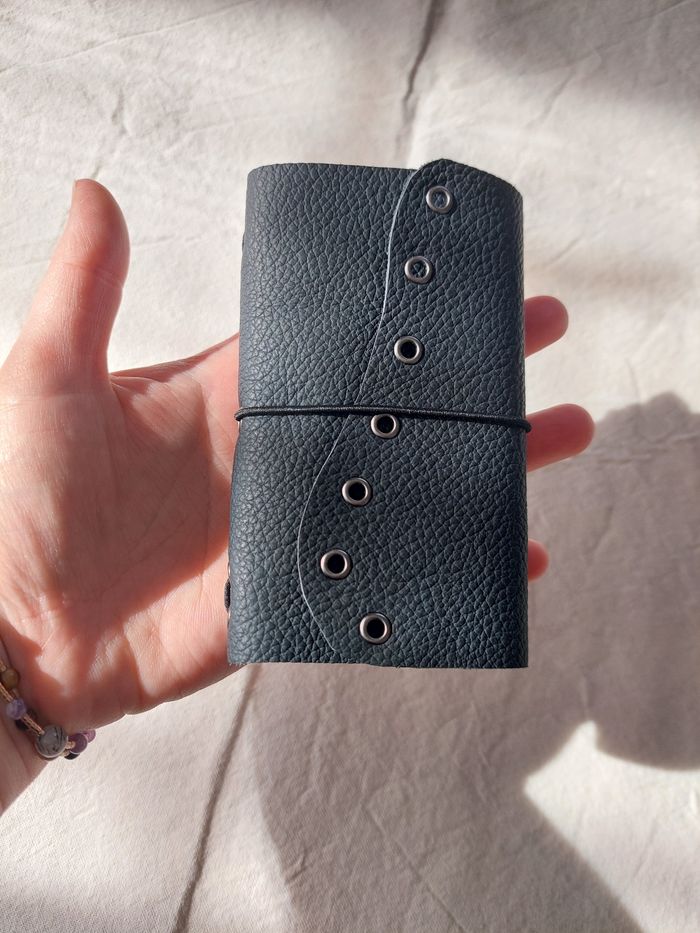 Mini journal en cuir noir Format mini, 7x12cm Peut contenir jusqu'à 4 carnets grâce aux élastiques Vrai cuir noir, élastiques noirs et œillets couleur gun black, pour un look rock gothique Deux carnets sont inclus dans la commande Fabrication artisanale, neuf Envoi rapide et soigné