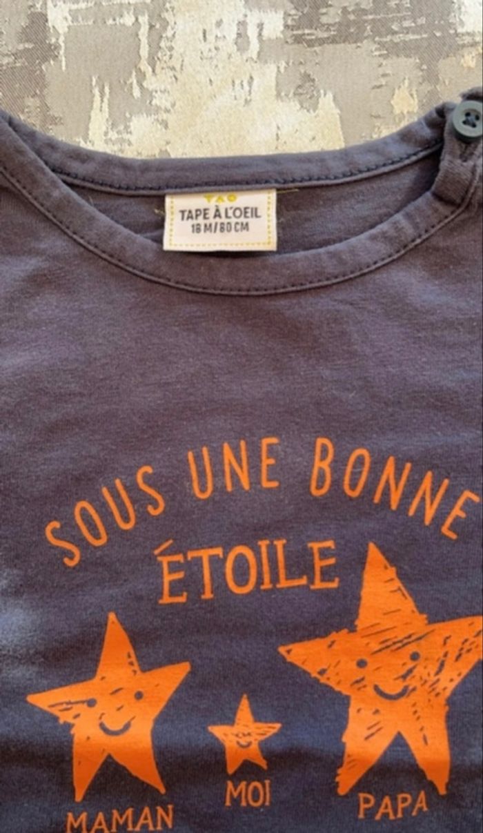 ⭐ Pull fin ML Tape à l’Œil – 18 mois – Bleu marine – TBE 👕 Pull fin manches longues bébé 📏 Taille : 18 mois 🎨 Couleur : bleu marine ✨ Inscription « sous une bonne étoile, maman papa moi » en orange ⭐ Motifs 3 étoiles sur le devant 🔘 2 boutons au niveau du col pour faciliter l’habillage 🏷️ Marque : Tape à l’Œil 🌿 Léger, confortable et agréable à porter 👶 Idéal pour la mi-saison ou le quotidien ✅ Très bon état (TBE) 📦 Envoi rapide 🚀 💸 Réduction sur les lots activée 🏷️ 👚 Dressing trié par # #pull #18mois #tapealoeil #bleumarine #bebe #modebebe #tbe