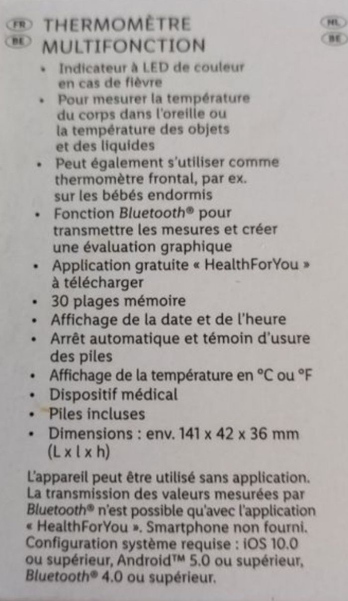 Thermomètre multifonctions Très peu servi Temperature oreille, temperature frontale, objet, touches sonores Avec notice Piles non fournies Sans boite