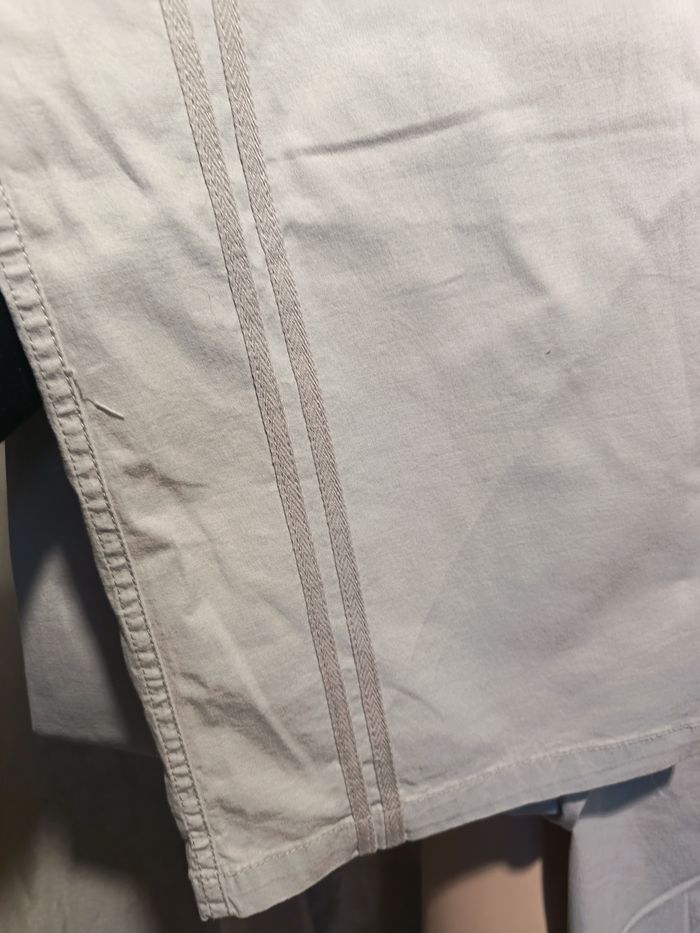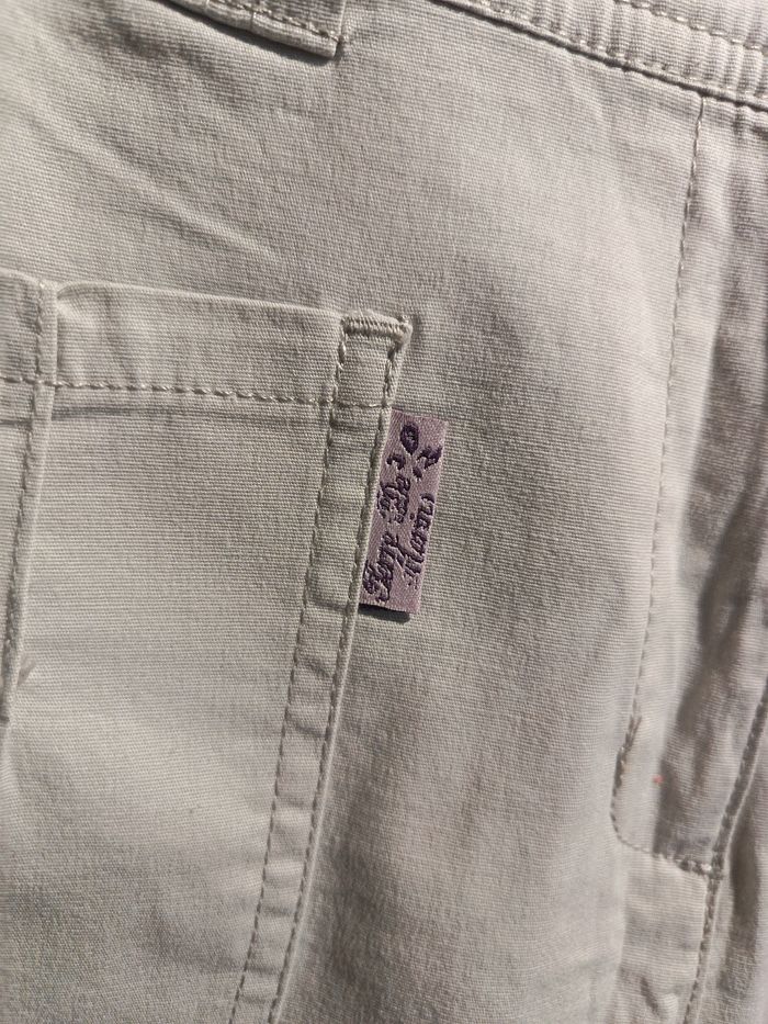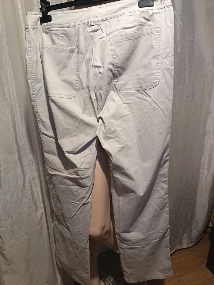 pantalon beige fermé devant par un boutons et une fermeture zippée élastique sous tunnel avec des boutons deux poches plaquées devant et derrière en déco deux bandes de tissus beige le long des jambes largeur taille 44 largeur bas24 longueur jambe84 longueur total 112