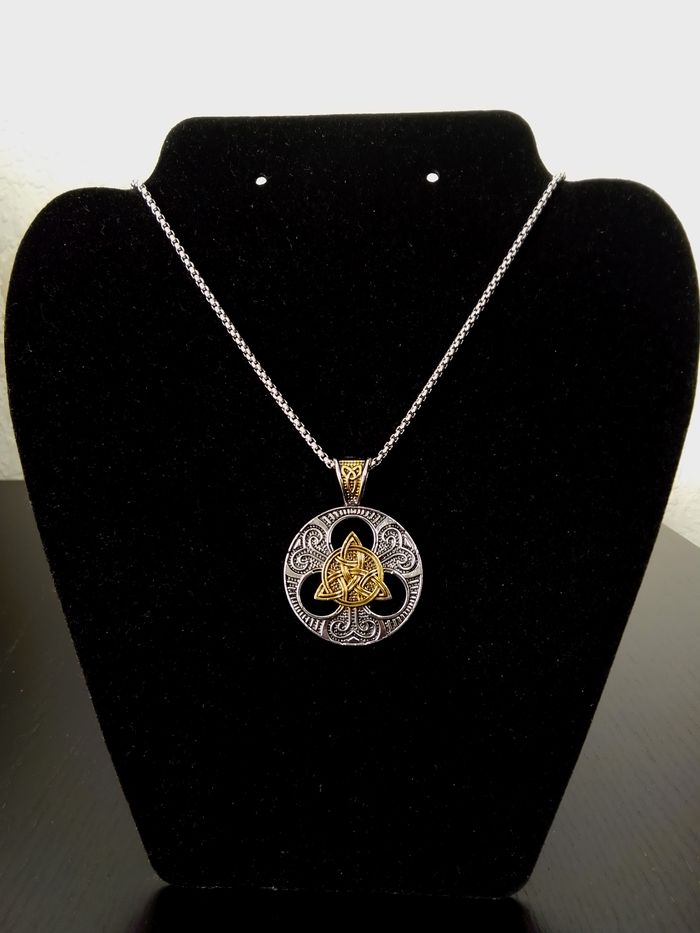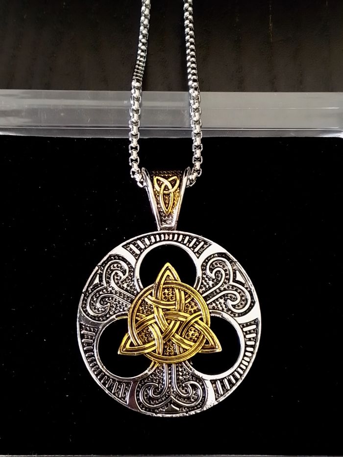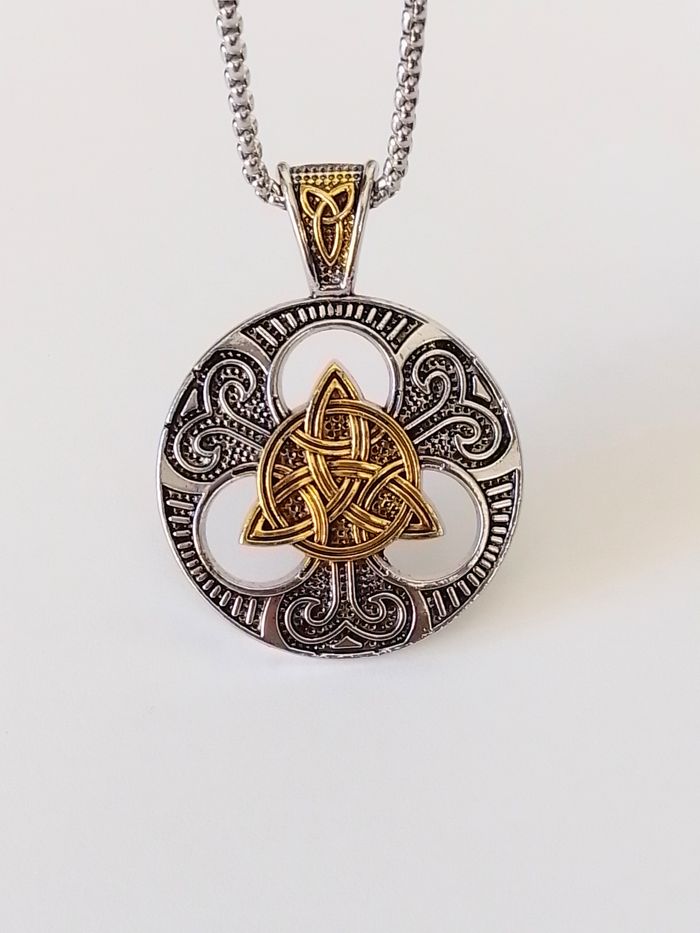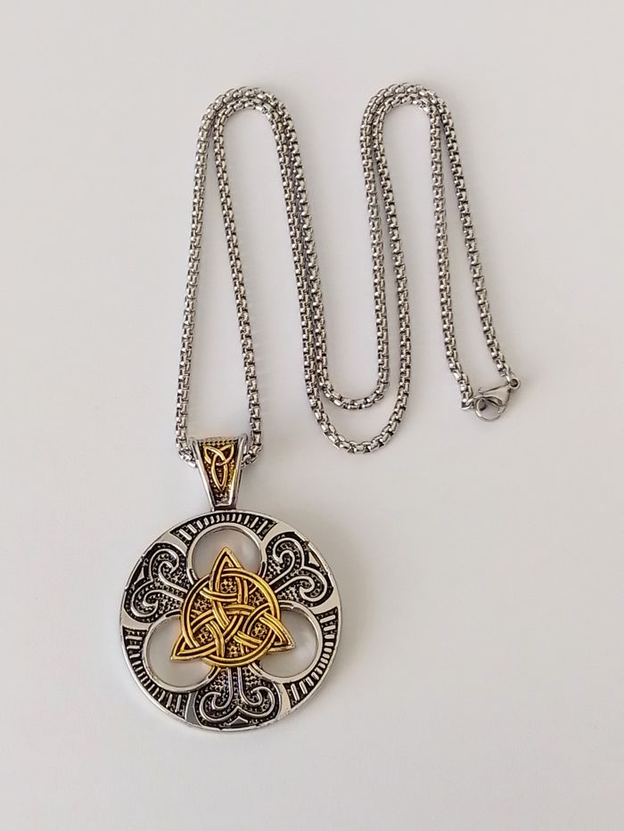 Chaîne + pendentif celtique. Motif : nœud celtique irlandais. (celtique, viking, protection, spirituel, idéal cadeau) DESCRIPTIF : Les deux faces sont identiques. Couleur : argenté, doré. Taille chaîne : 60 cm Diamètre pendentif : 3,8 cm L * 5 cm H Envoi rapide et soigné.