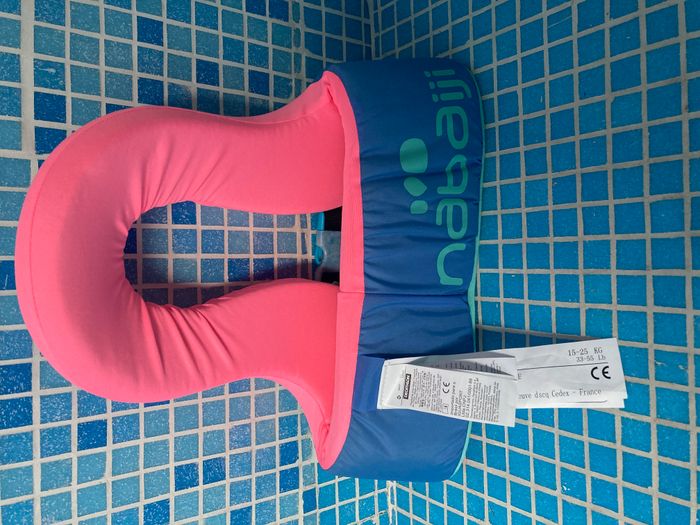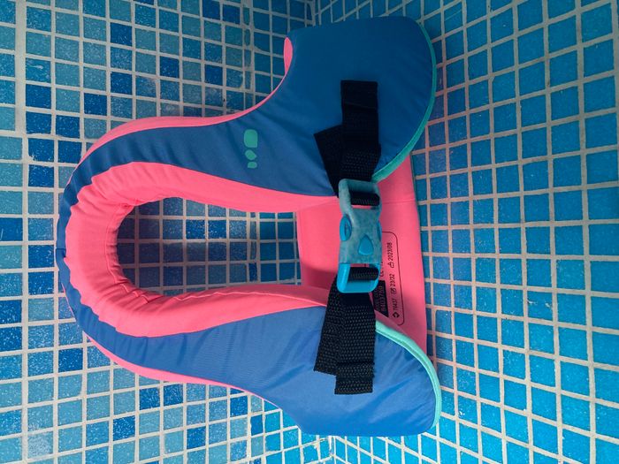 Gilet de natation Nabaiji (Decathlon), conçu pour l'apprentissage de la nage et l'aisance aquatique. Marque : Nabaiji (Decathlon). Taille / Poids : Adapté aux enfants de 15 à 25 kg. Sécurité : Boucle de serrage sécurisée à l'avant pour un maintien parfait. Coloris : Rose et bleu, très visible dans l'eau. État : Comme neuf. Il a très peu servi. La matière est impeccable. Prix d'origine : 23 €. #Nabaiji #Decathlon #GiletDeNatation #NatationEnfant #SecuriteAquatique #Puericulture #ApprentissageNage #EteBebe #VacancesMer #PiscineEnfant #DecathlonOccasion