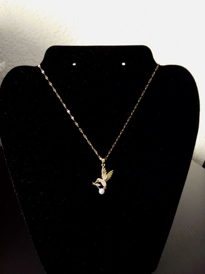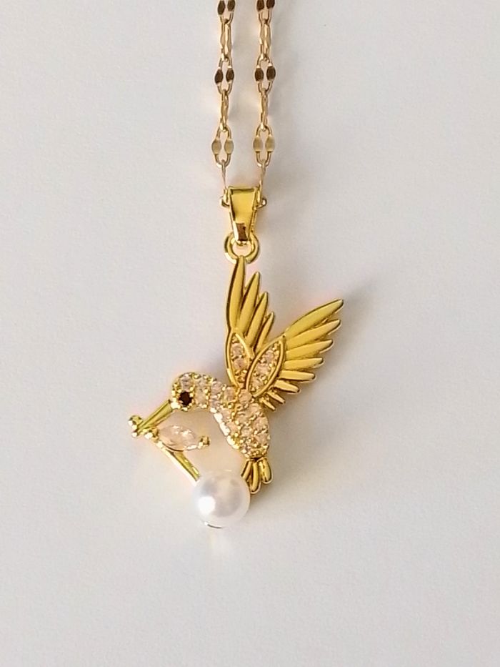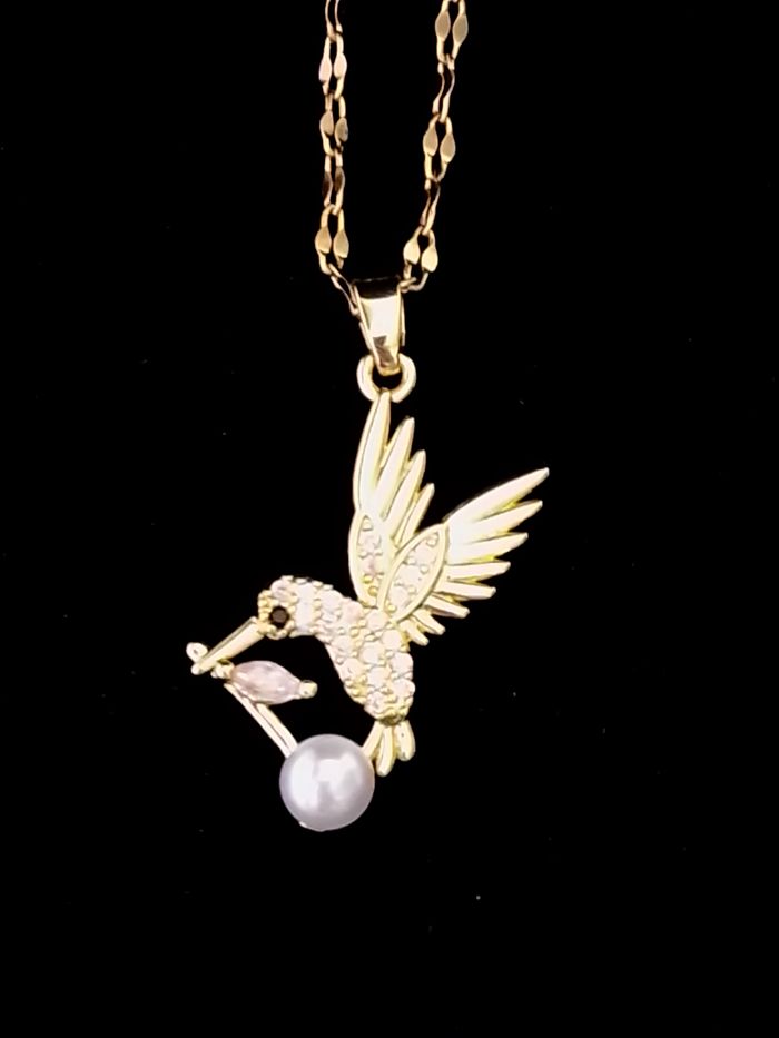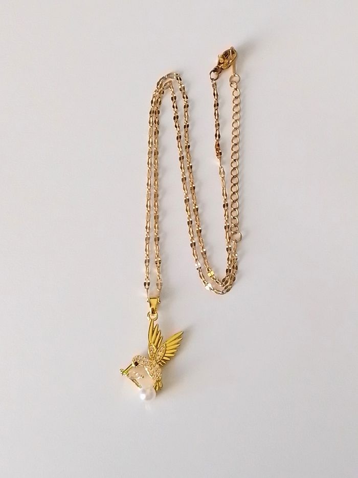 Chaîne + pendentif élégant. Pendentif : colibri, strass. (élégant, bohème, boho-chic, idéal cadeau) DESCRIPTIF : Couleur : doré, blanc. Taille chaîne : 40 cm + 5 cm Diamètre pendentif : 2 cm L * 2,7 cm H Envoi rapide et soigné.