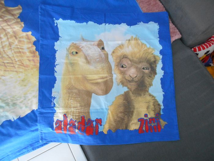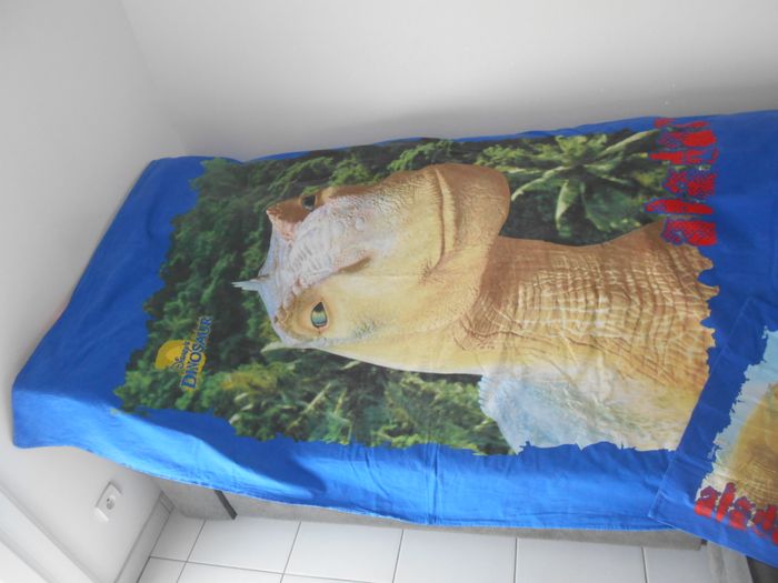 Vends cette housse de couette dinosaures et sa taie d'oreiller de la marque Disney, pour lit 1 personne, en bon état, sans trou, ni tache, maison non fumeur et sans animaux.