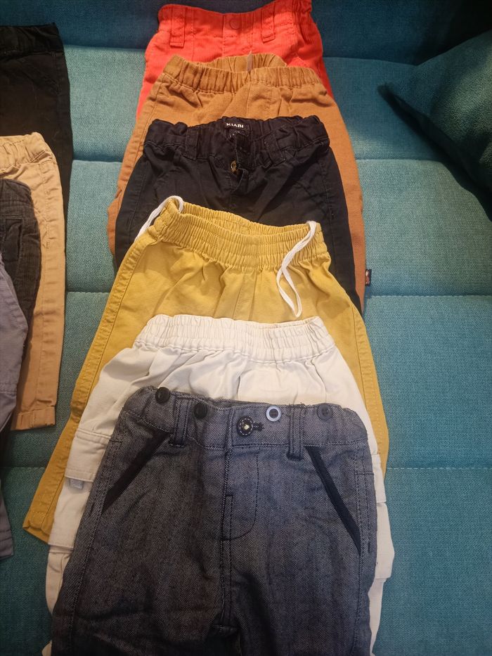 6 pantalons 3 vestes 1 salopette 14 t shirt manches longues 1 chemise 1 pull 1 gigotteuse 12 joggings 4 Tshirt manches longues 1 veste chaude 1 combi pilou pilou 15 pyjamas 18 bodys
