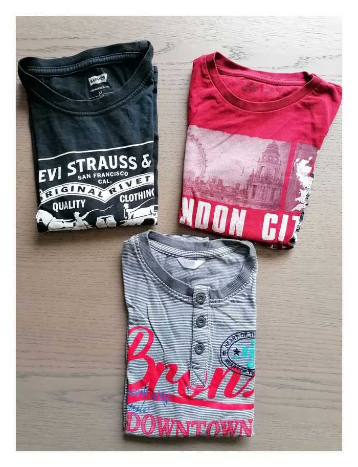 Lot de 3 T-shirts manches longues garçon. 6 ans Détail du lot : - 1 T-shirt rouge avec sequins London city - 1 T-shirt gris clair - 1 T-shirt noir et blanc Levi's #elojohn6ansgarcon #6ans #6ansgarçon #lot6ans