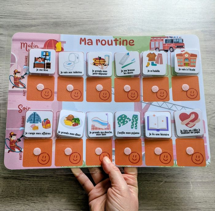 Aidez votre enfant à structurer sa journée avec plaisir et autonomie. Ce tableau de routine sur les pompiers et incendie transforme les habitudes du quotidien en un jeu visuel, simple et motivant, favorisant confiance, repères et responsabilisation. ❓ Pourquoi adopter une routine visuelle ? 🔸 Encourage l’autonomie dès le plus jeune âge 🔸 Apaise les transitions (matin, repas, coucher, école…) 🔸 Réduit le stress et les conflits du quotidien 🔸 Renforce la confiance en soi grâce à un suivi concret 🔸 Permet aux parents de gagner du temps et de la sérénité 🔸 Idéal pour la maison, la crèche et l’école ✅ Contenu du kit 🔸 1 tableau format A4 camion de pompier et casque 🔸 30 vignettes à scratch représentant les moments clés de la journée (toilette, repas, jeux, école, coucher…) 📋 Caractéristiques 🔸 Format du tableau : A4 🔸 Taille des vignettes : env. 4 × 4 cm 🔸 Papier épais : 200 g/m² (tableau) / 160 g/m² (vignettes) 🔸 Plastification résistante : 125 × 2 microns 🔸 Scratchs solides 10 mm 📝 Vignettes incluses Je mets ma veste et mes chaussures Je vais aux toilettes X2 Je lave les mains et mon visage Je me brosse les dents x2 Je prends ma douche, mon bain Je me coiffe Je m'habille Je prends mon petit déjeuner Je me lève J'enfile mon pyjama Je fais un câlin à maman ou papa Je me couche Je change ma couche X2 Je prends mon dîner Je me lave les mains Je range mes jouets Je m'occupe des animaux Je fais mon lit Je lis une histoire Je débarrasse la table Je joue Je prépare mon sac Je range mes affaires Je vais à l'école Je prends mon goûter Je mets la table Je fais mes devoirs 🧷 Fixation murale non incluse 🌈 Support durable, réutilisable, d’inspiration Montessori, pensé pour accompagner l’enfant vers plus d’autonomie à son rythme. 📬 Envoi rapide et soigné 💬 N’hésitez pas à me contacter pour toute question 😊