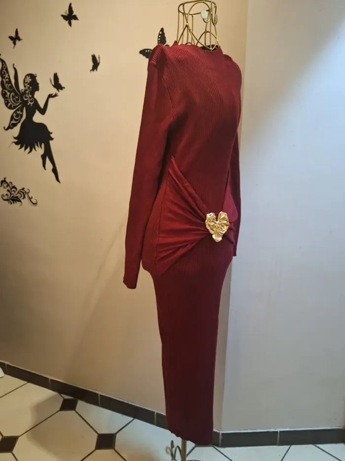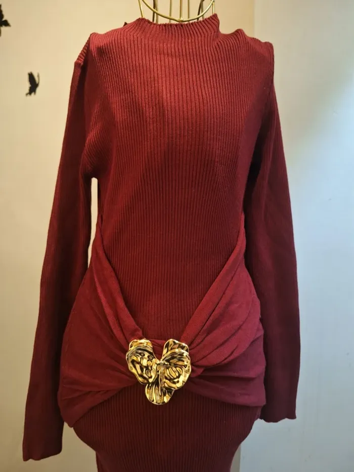 Robe longue bordeaux en mailles & bijoux doré - photo numéro 1