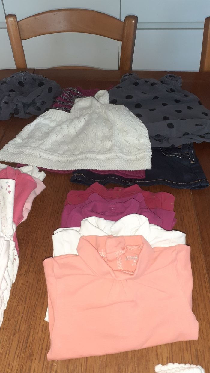 1 gigoteuse avec manches amovible, 6 pyjamas, 7 bodies, 5 collants, 4 paires de chaussettes, 5 sous pull, 4 robes, 1 short, 2 bavoirs, 1 paires de baskets Minnie, 1 paires de bottines fourré, 1 paires de chaussons, 1 paires de baskets rose.
