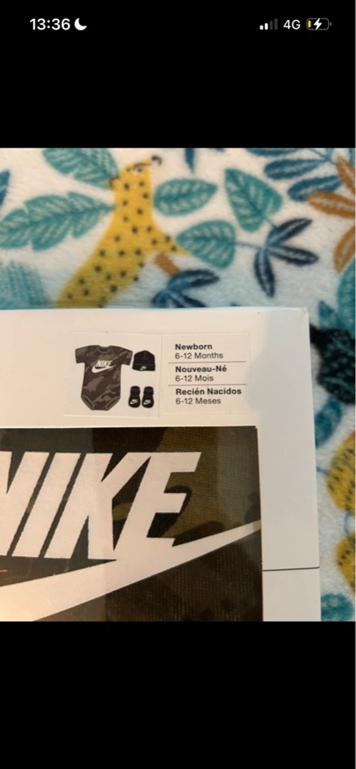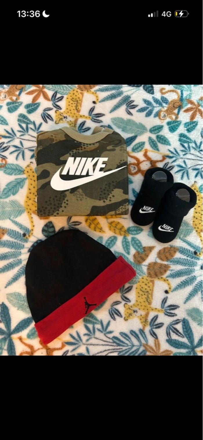 Set Nike comprenant 3 pièces Avec un body militaire Et des chaussons noir le bonnet n’est pas celui d’origine Taille 6/12 mois Neuf jamais utilisée