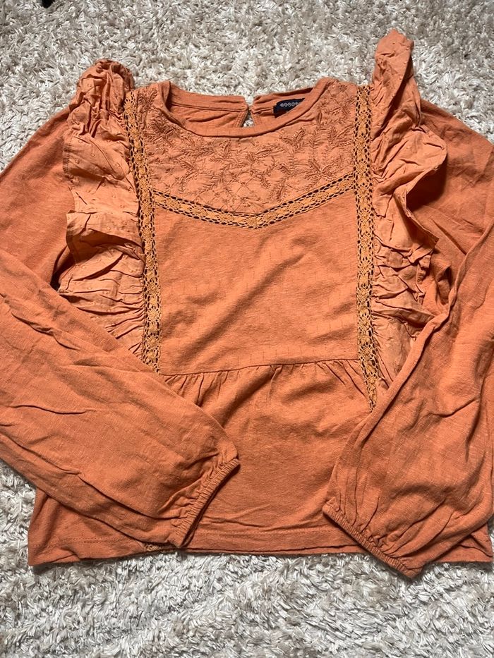 Blouse ballon dentelle orange rouille taille M bonobo élégante très jolie tu avec un petit cardigan sans manche