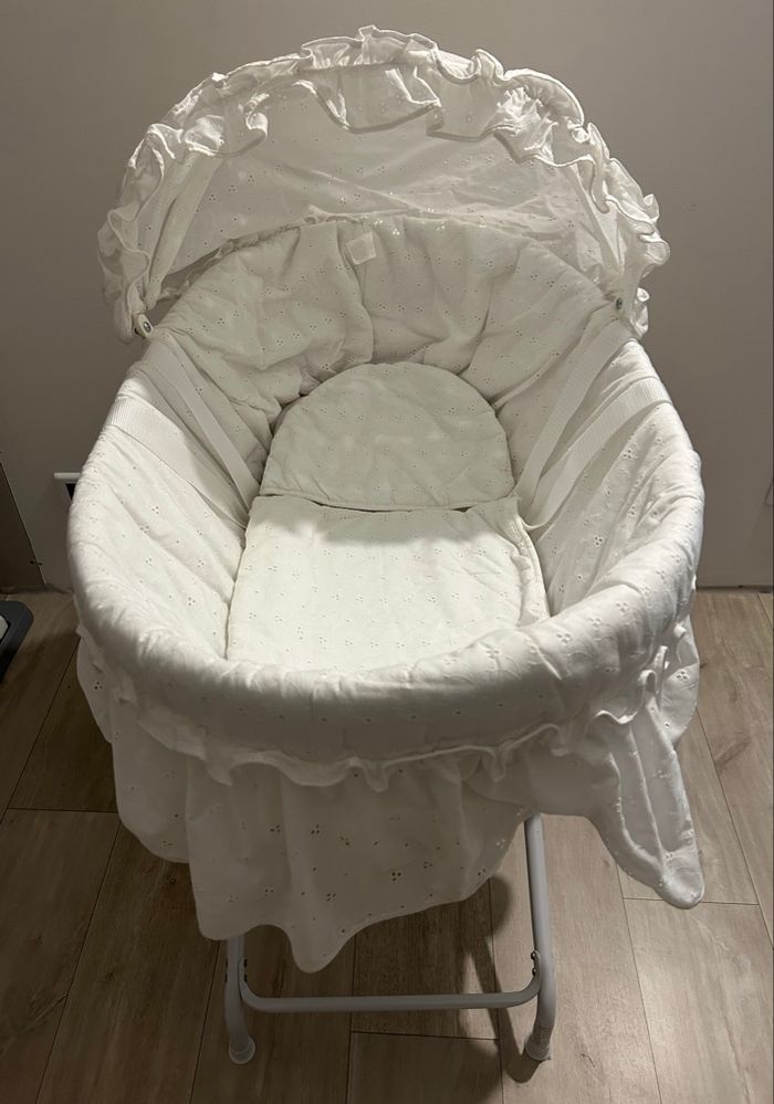 Couffin bébé sur support, petit oreiller et couverture, très peu utilisé. REMISE EN MAIN PROPRE