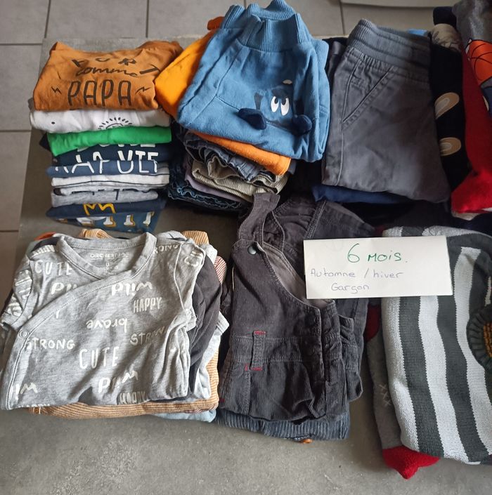 Lot de vêtements 6 mois garçon automne hiver soit 61 articles en bon état général Comprends : 9 pyjamas 5 vestes 2 pulls 2 salopettes 8 ensembles 10 bodys manches longues 12 t-shirts manches longues 13 pantalons