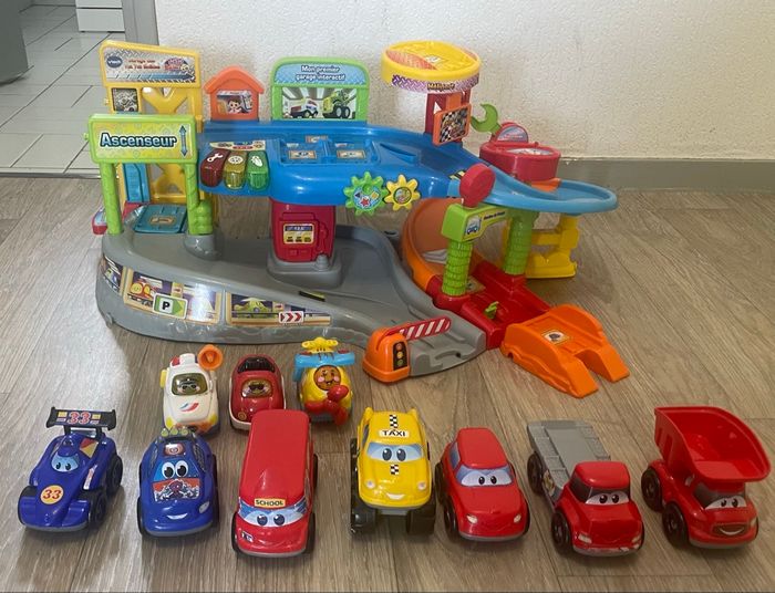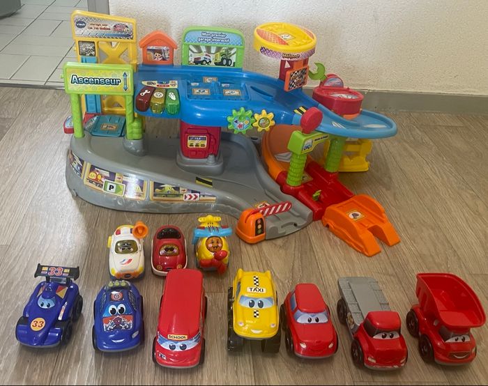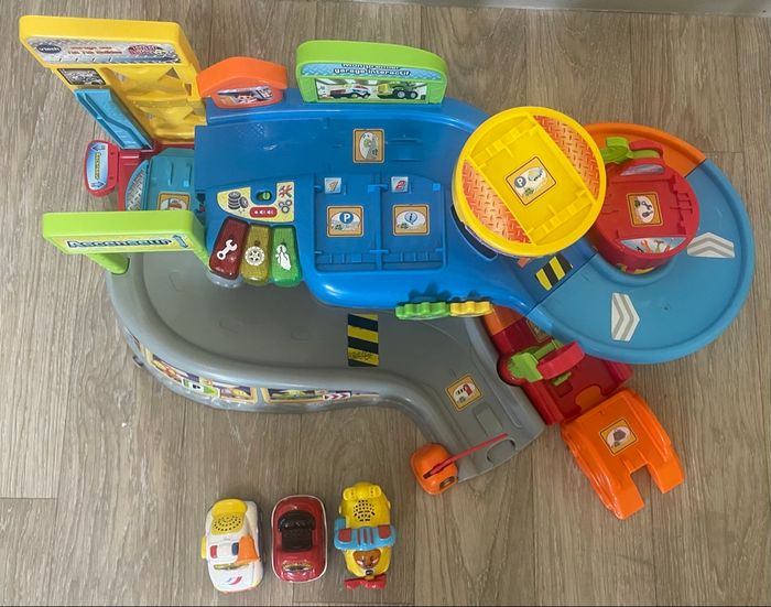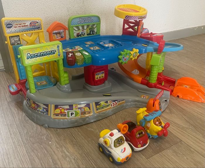 Mon premier garage interactif - Tut Tut Bolides Descriptif Le garage vient avec 3 véhicules électroniques et lumineux Yanis, le capitaine de police, Timothée le super cabriolet, Maelys l’avion à hélice. Il parle, chante et possède sa propre personnalité ce qui amusera beaucoup votre enfant. Tout en s'amusant à faire rouler les véhicules sur le circuit, votre enfant peut commencer à apprendre les couleurs, différents éléments du garage et à avoir des notions de sécurité routière grâce aux 3 touches lumineuses. Il va également développer sa motricité en manipulant tous les éléments du garage comme les engrenages, les clés à molette, et toutes les couleurs vont attiser sa curiosité ! En plus l’ascenseur reconnait chacun des étages. Les moments de jeux et d'apprentissages avec ce jouet électronique sont rythmés par plus de 40 phrases, chansons, mélodies et autres sons entraînants. Tout le garage est compatible avec les véhicules et univers Tut Tut Bolides et Tut Tut Animo. Il est possible de régler le volume sonore de ce jouet. Vends avec 7 voitures non compatibles avec le garage. Âge 1 an Marque VTech Dimensions L38xH13xP50 Poids 2.3 Bon état général, manque 2 pièces (1 barre tour hélicoptère et 1 barre pour l’ascenseur)
