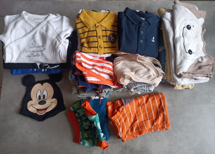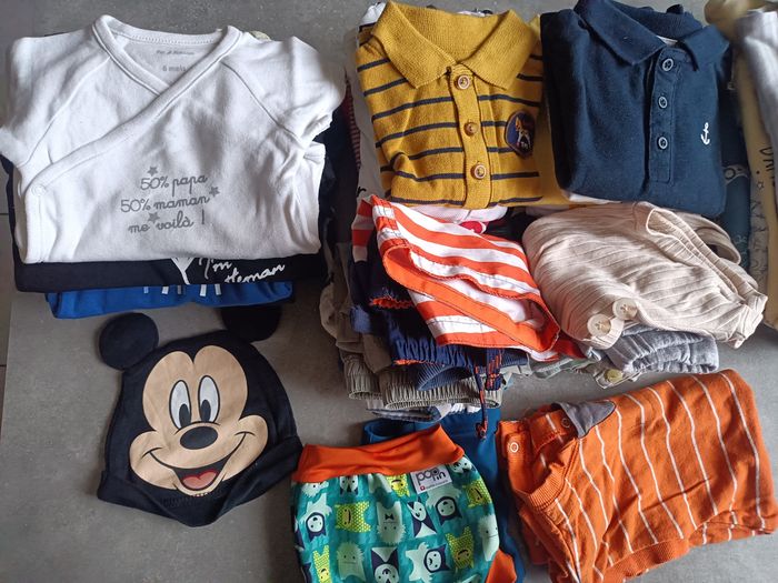 Lot Vêtements 6 mois garçon printemps été soit 55 articles en bon état général Comprends : 17 bodys manches courtes 20 t-shirts 10 shorts 1 barboteuse 7 pyjamas légers manches longues