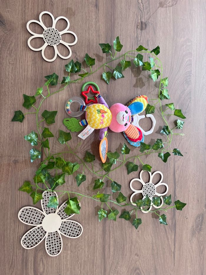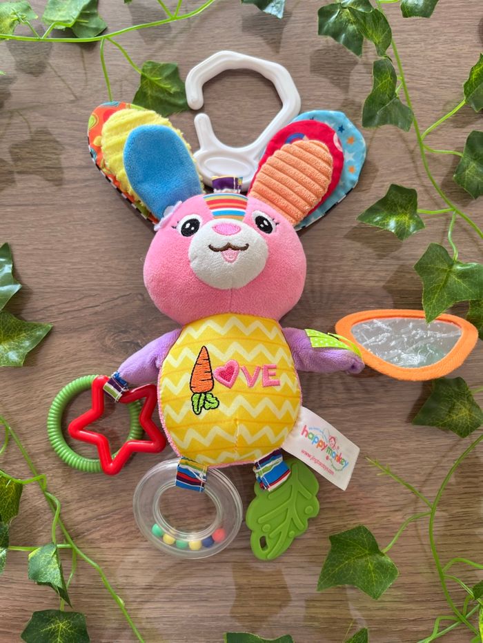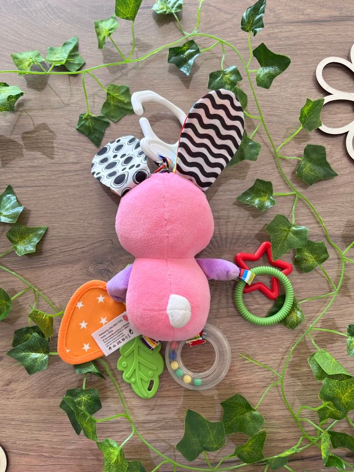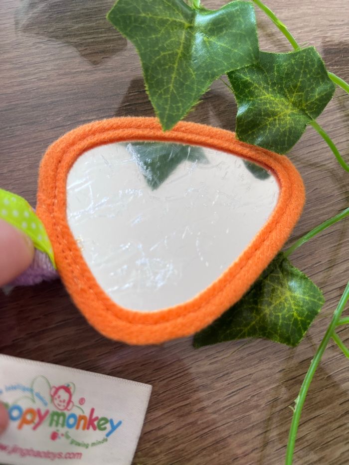 Hochet d’éveil à suspendre Protection encore sur le petit miroir Matière qui se froisse et fait du bruit Anneau de dentition divers matières et tissus Petites billes qui font du bruit. #emy200309_jeuxeveil