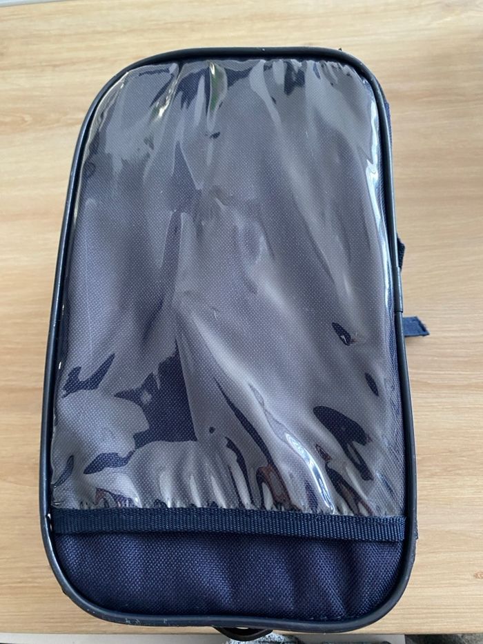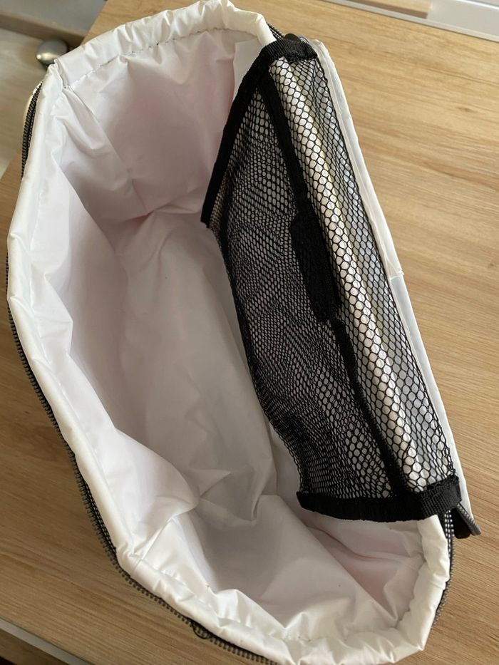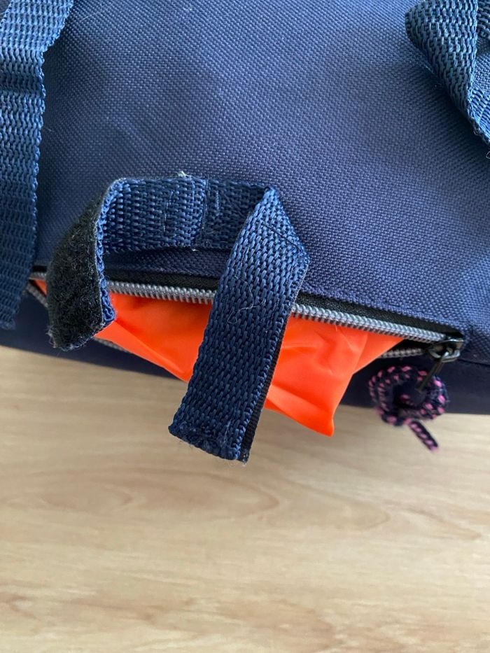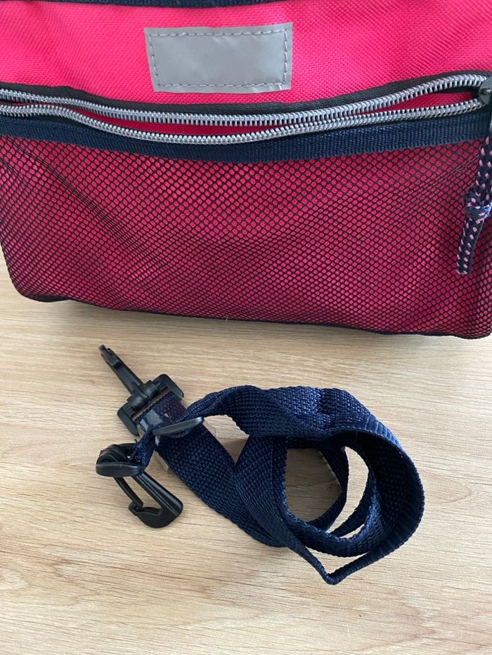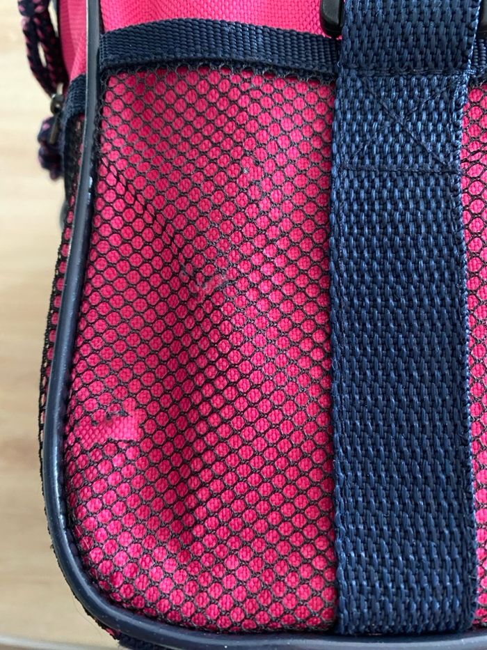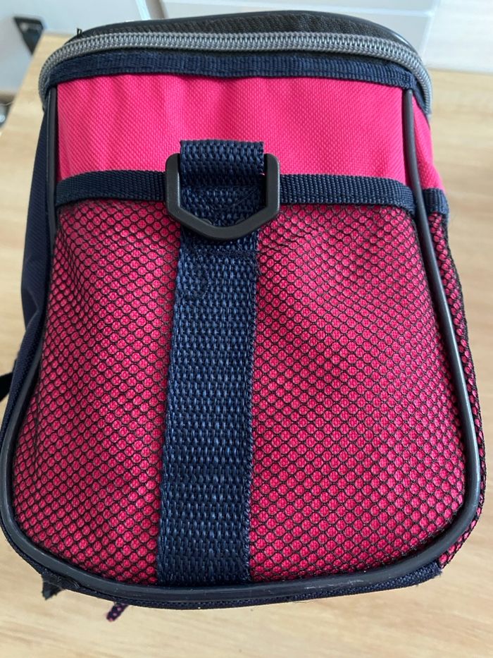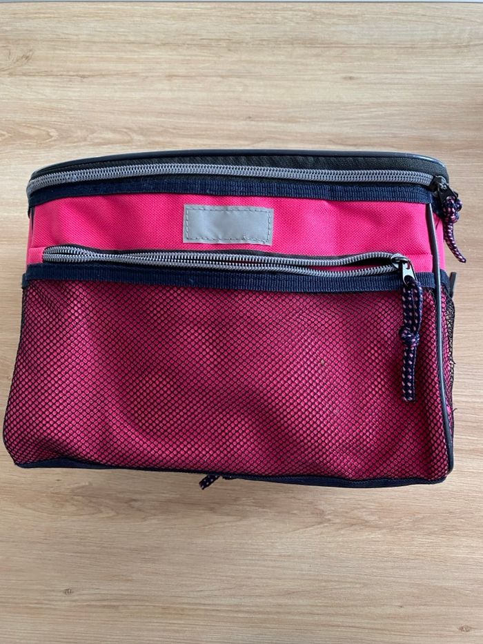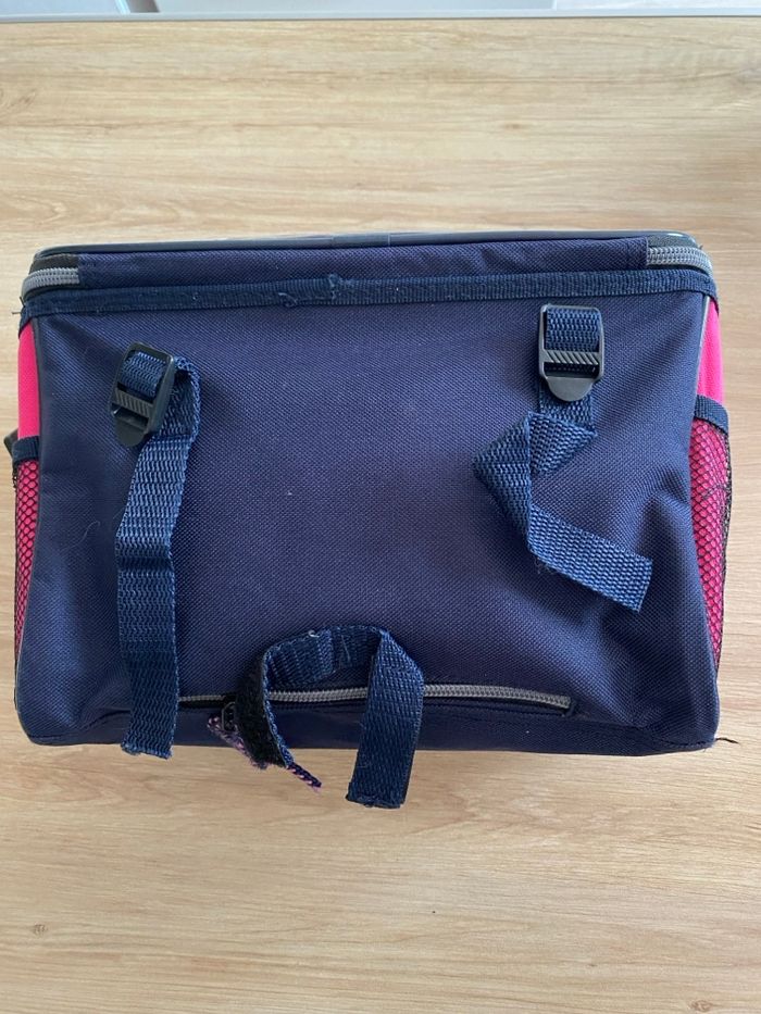 Sacoche isotherme rose et bleu avec housse de pluie intégrée pour guidon vélo, présente quelques accros sur un filet du côté visible sur les photos #vélo #sacoche #isotherme #rose #bleu #tresbonetat