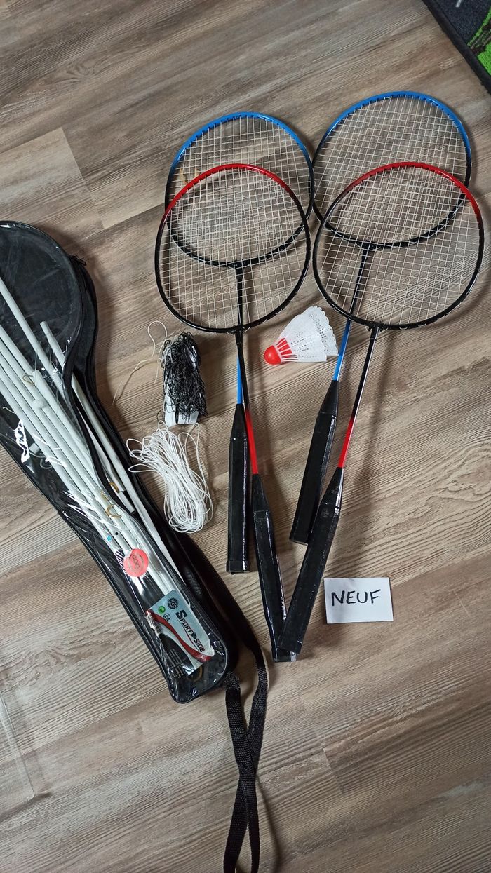 Lot pour badminton plein air Contient un filet a monter, 4 raquettes et 2 volants Neuf, seule la pochette de rangement ne ferme plus