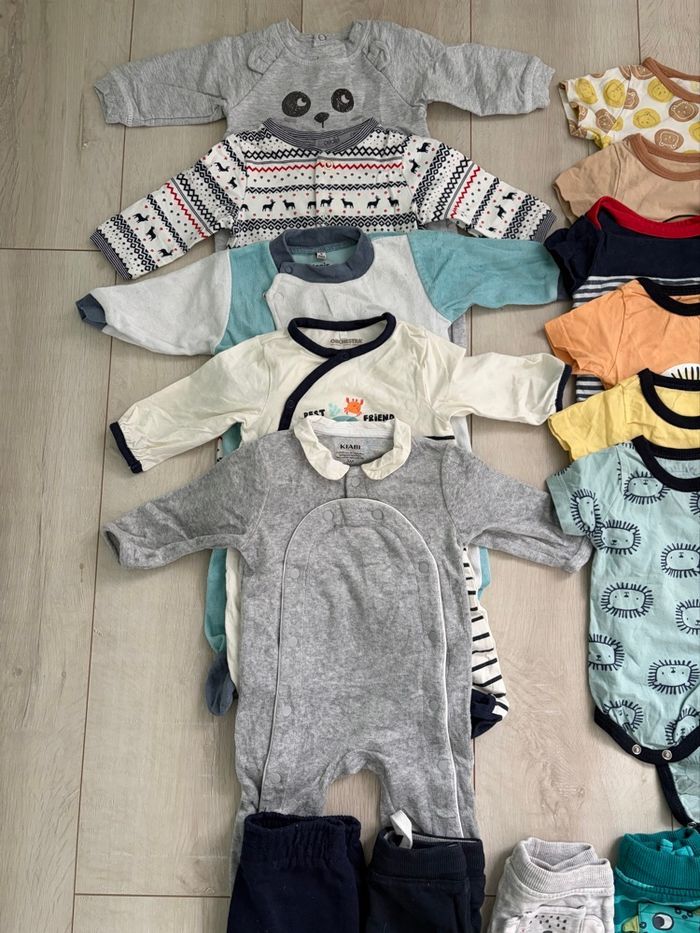 Lot de vêtements 3 mois garçon - 5 pyjamas - 10 bodies manches courtes - 4 t-shirt manches longues - 2 pulls - 2 gilets - 1 chemise - 1 salopette - 1 ensemble pull/pantalon - 4 pantalons Multi marque Maison non fumeur Les vêtements sont stockés dans des poches sous vides