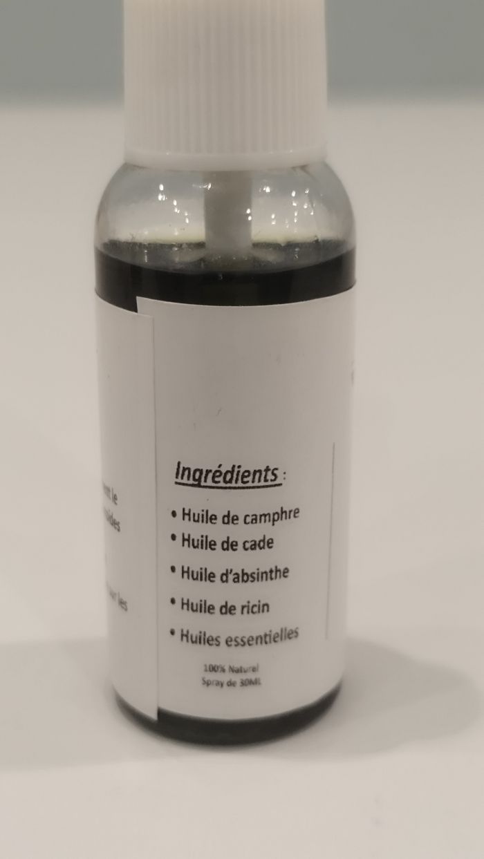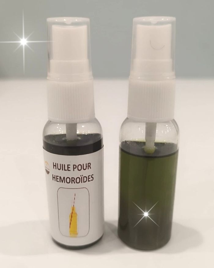 HUILE POUR hémorroïdes 100% Naturel efficace dès les premières utilisations Ingrédients : - Huile de camphre - Huile de cade - Huile d’absinthe - Huile de ricin - Huiles essentielles Mode d’emploi : Appuyer sur le spray sur la zone présentant les hémorroïdes 2 Sprays de 30ML