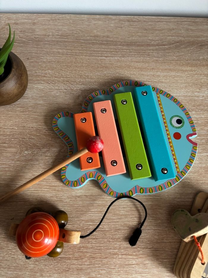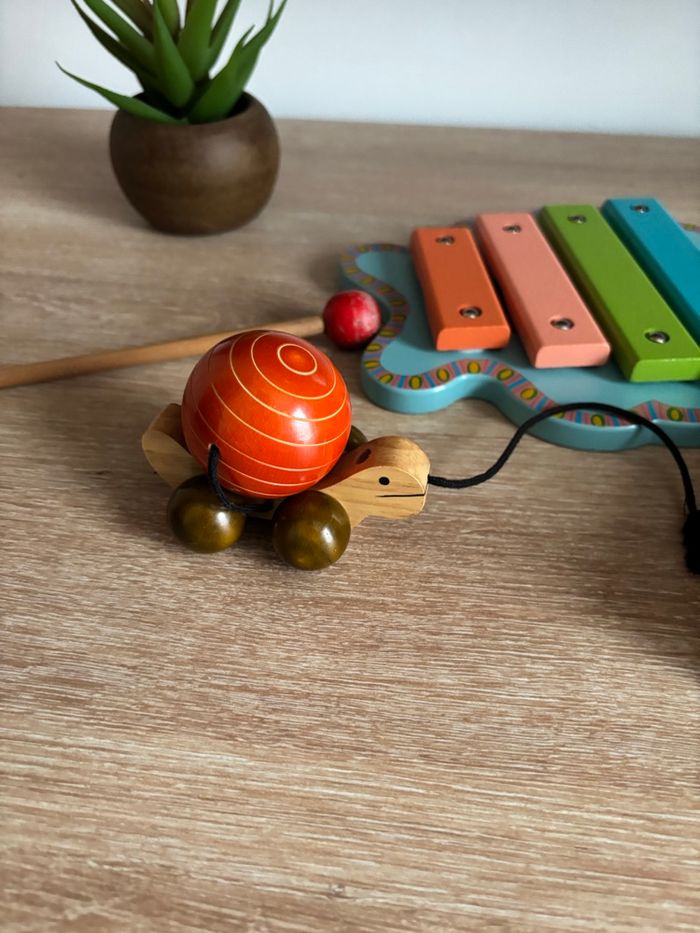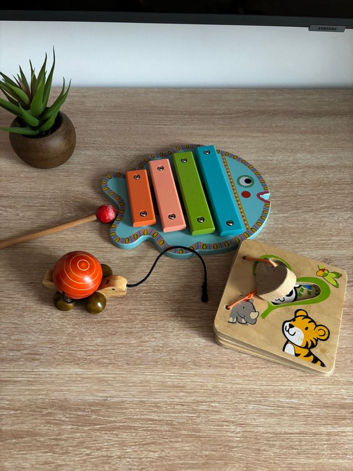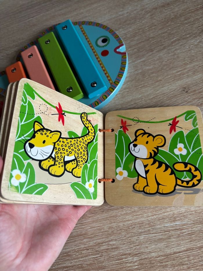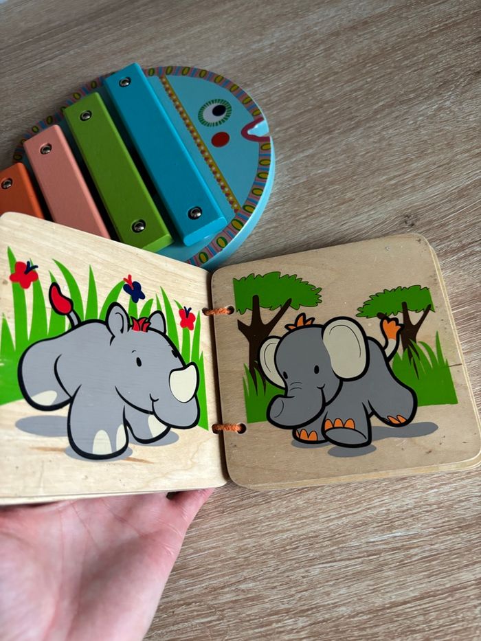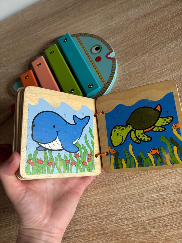 Petit lot de jouet en bois éveil bébé Xylophone djeco Tortue à tirer Livre en bois les animaux