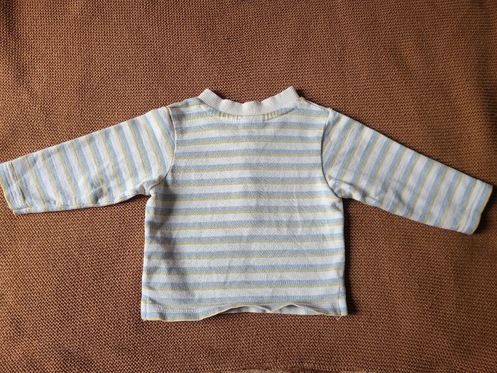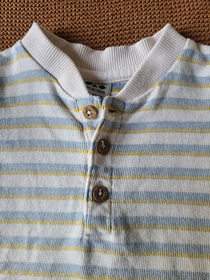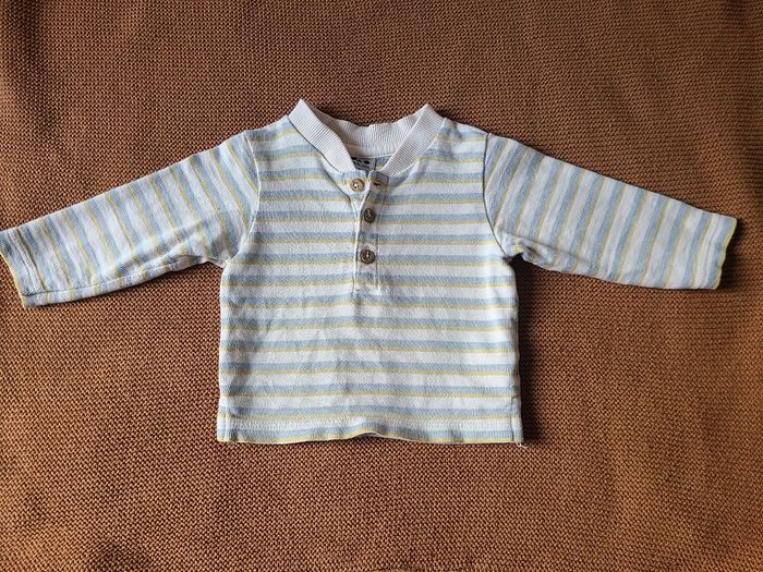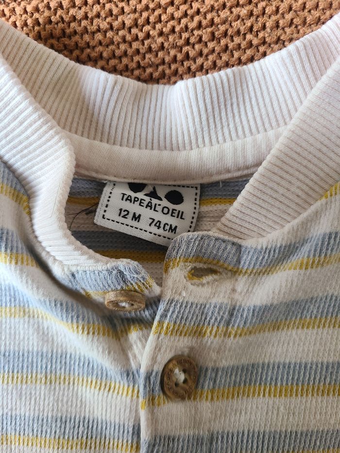 T-shirt bébé à manches longues, matière épaisse type jersey côtelé, idéal pour l’automne/hiver. Rayures fines dans des tons doux (écru, bleu et jaune). Col tunisien avec boutons sur le devant pour un style décontracté et un enfilage facile. ✔️ Très bon état ✔️ Marque : Tape à l’Œil ✔️ Taille : 12 mois ✔️ Tissu confortable