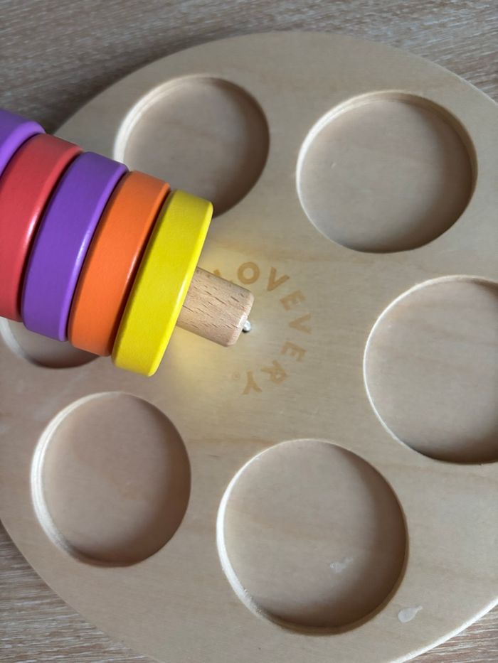 Tour d’empilage en bois Lovevery Anneaux de couleur J’ai rajouter des fiches papiers pour trier les couleurs Type montessori Complet D’autres annonces jouet en bois ou Lovevery dans mon dressing