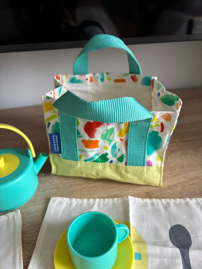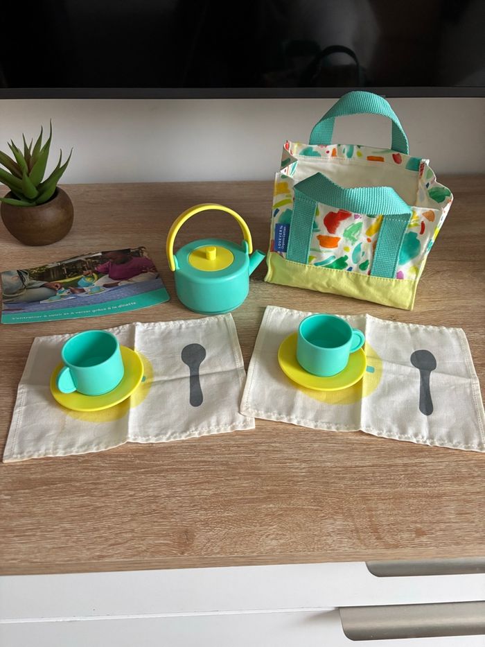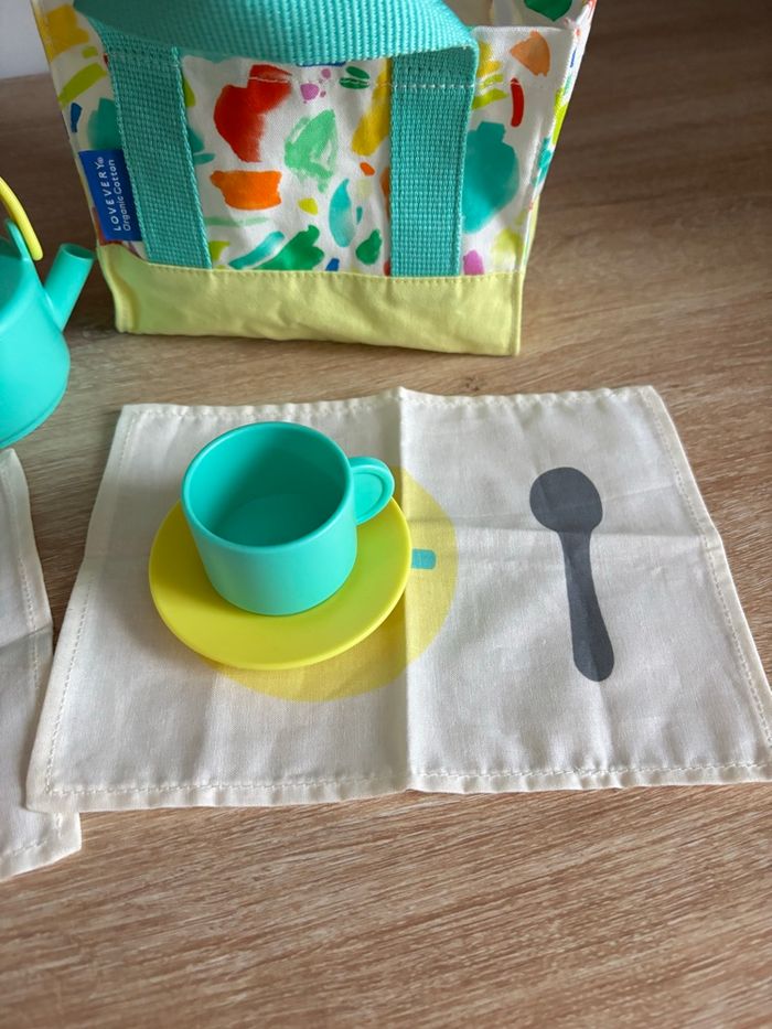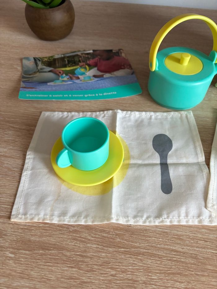 Dînette Lovevery bleu et jaune Nouvelle version avec théière set de table et son sac en tissu pour ranger Attention je n’ai pas les cuillères.