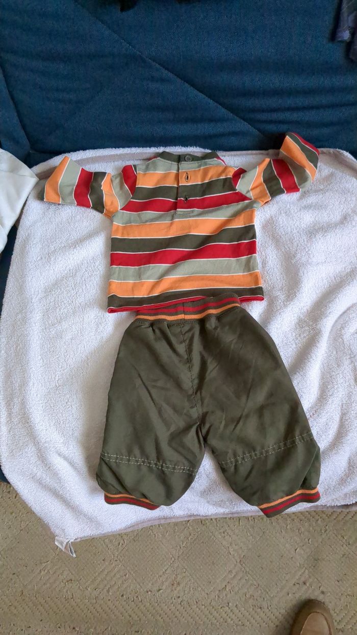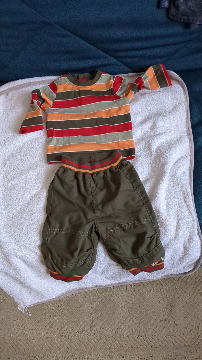 Tee shirt 61% coton et 39% polyester manches longues rayé kaki, orange, gris et blanc et pantalon kaki élastiqué polyester doublé coton