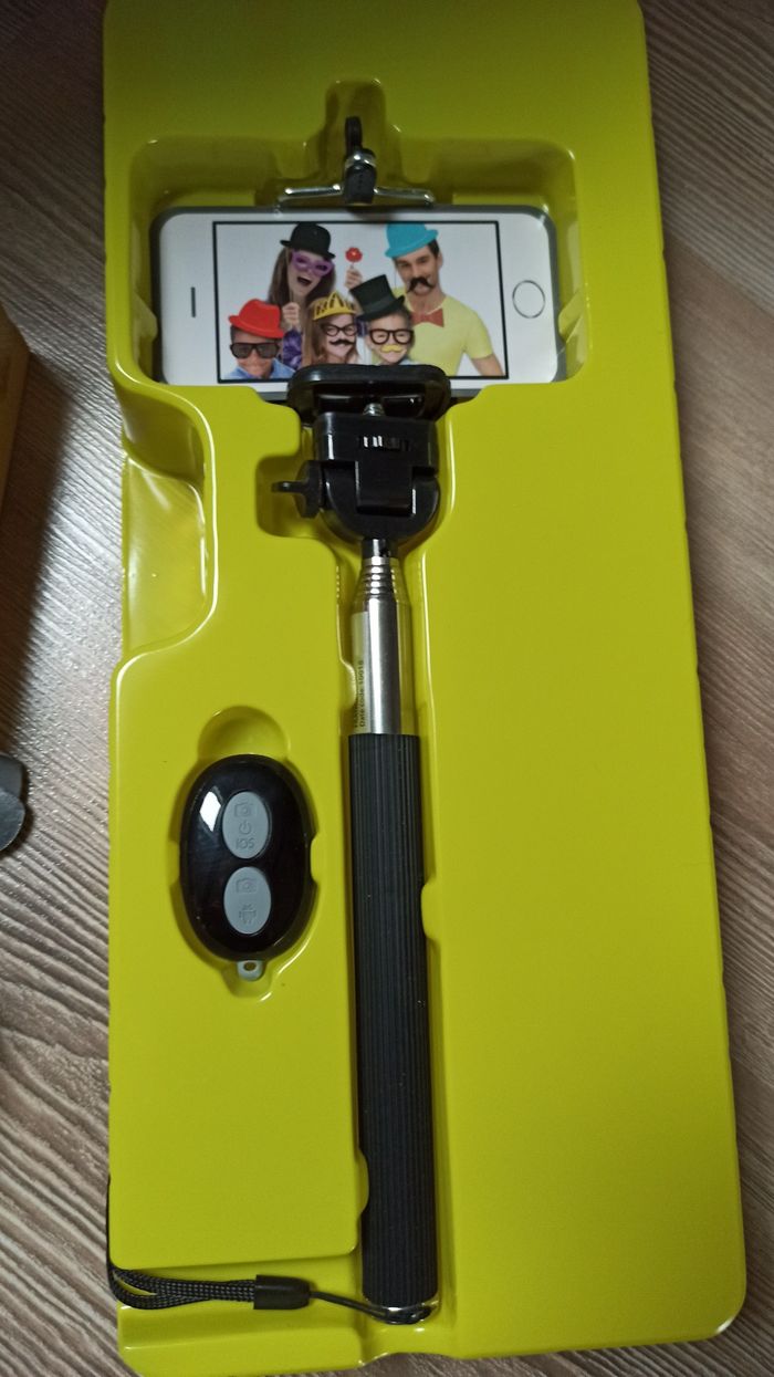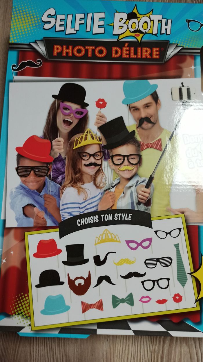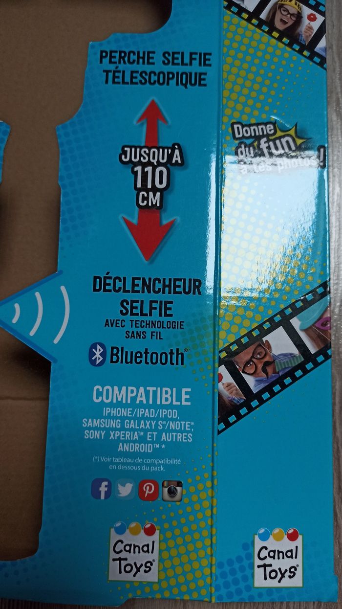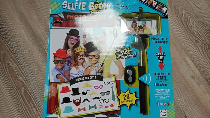 Boite neuve pour fete, photos Perche à selfie avec accessoires Il suffit de fixer la perche à selfie à un téléphone iOS ou Android compatible. Utilisez la télécommande sans fil Bluetooth pour prendre des photos et immortaliser des expressions spontanées, des événements et des occasions. Idéal pour les fêtes, les vacances, les voyages, les événements d'équipe et bien plus encore. Comprend une perche à selfie extensible, une télécommande sans fil Bluetooth et 25 accessoires photo stylés.