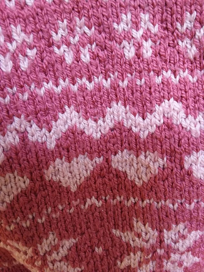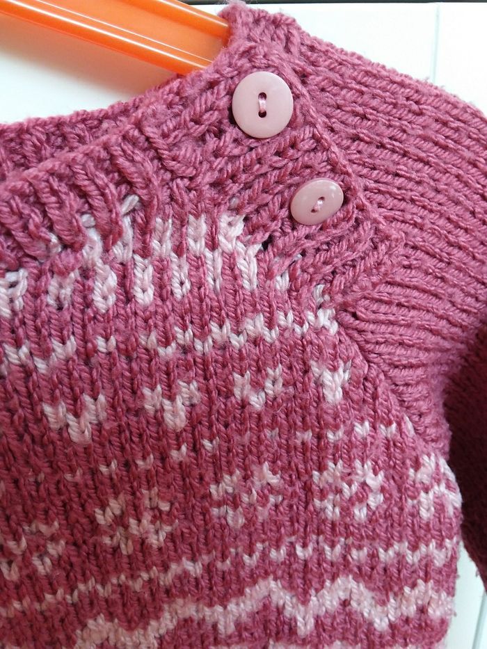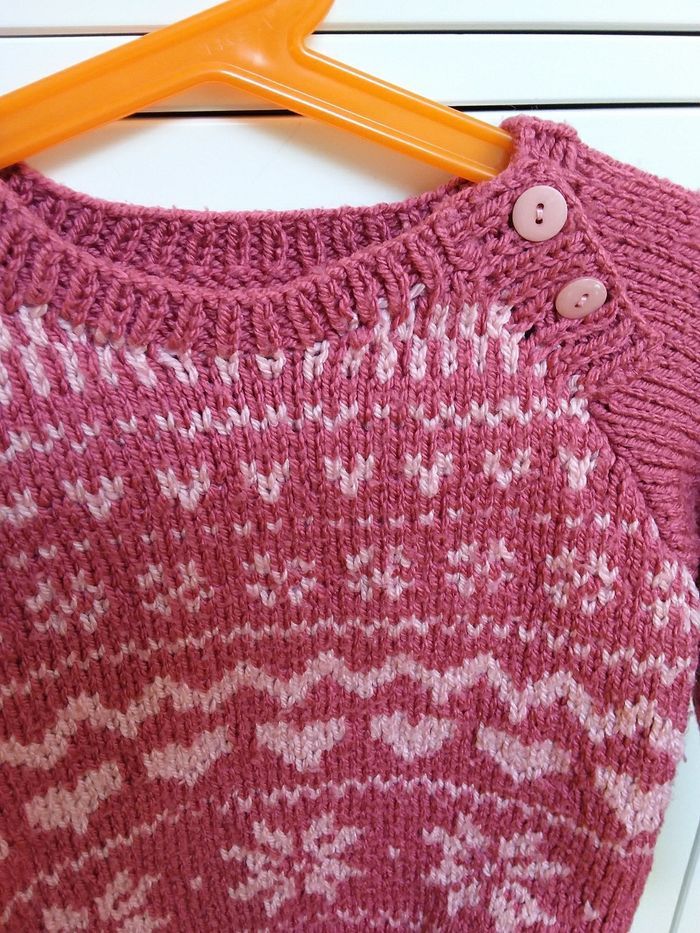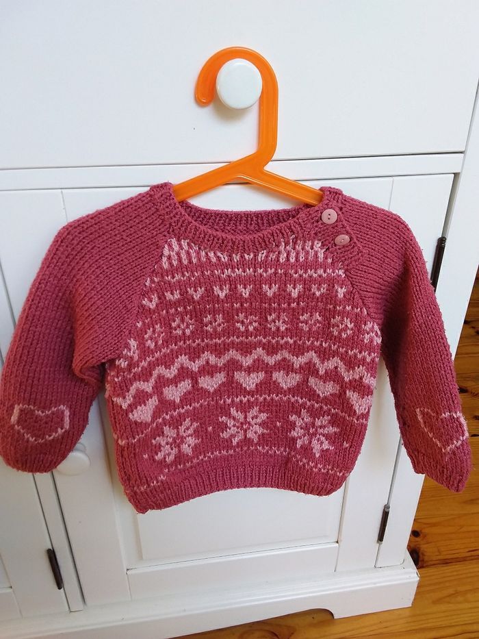 En laine acrylique, facile d'entretien, joli pull jacquard à motif cœurs fait main. Couleur lie de vin et rose poudré. Ouverture sur le raglan très pratique, par 2 boutons colorés.