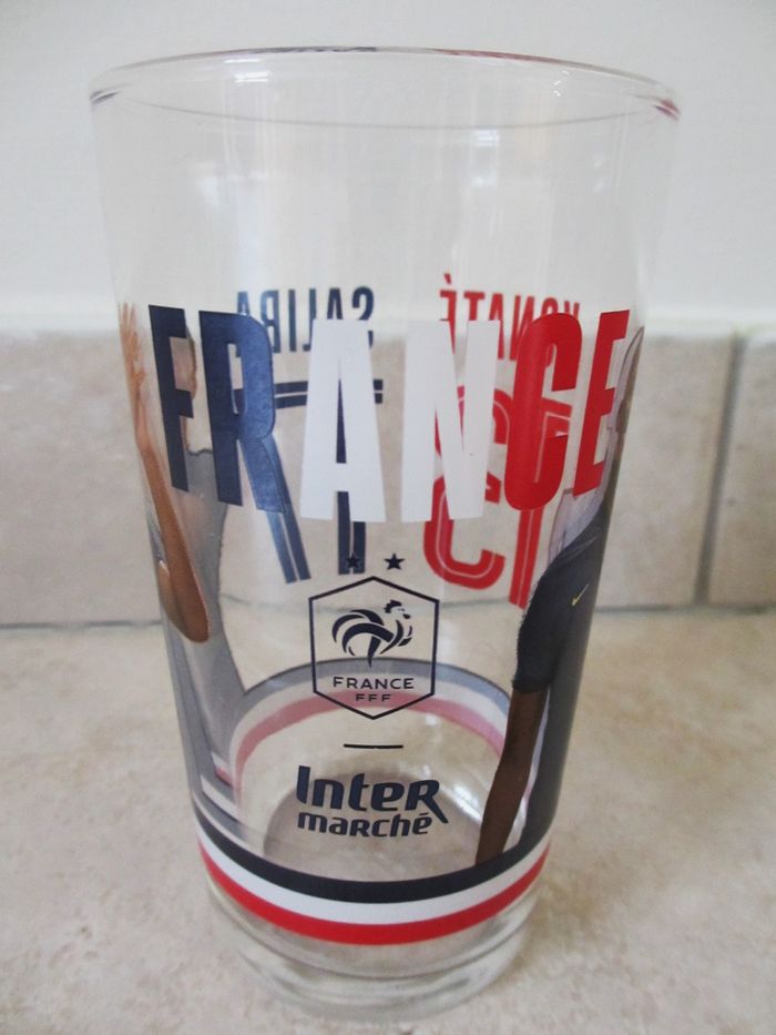 Verre équipe de France de football 2024 Konaté et Saliba Hauteur 12 cm. Contenance 25 cl. Etat neuf.
