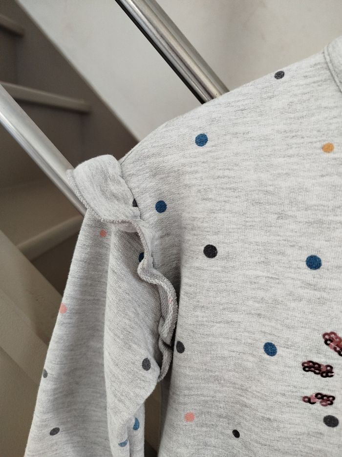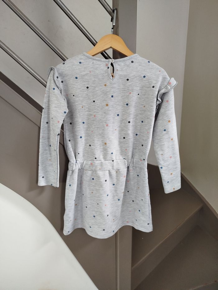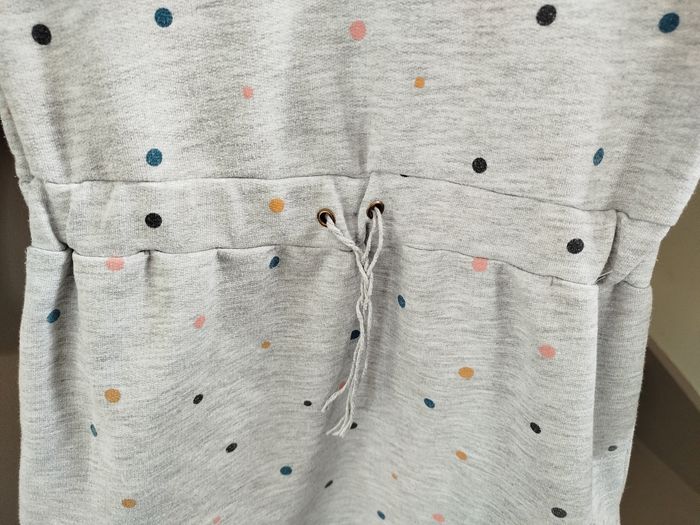Robe grise à pois colorés, petits volants aux épaules. Lacets décoratifs à la taille. Marque Gémo, taille 8 ans. Réduction activée sur les lots. #fille #robe #gemo #8ans