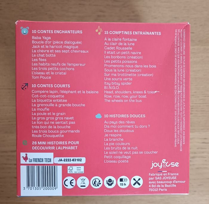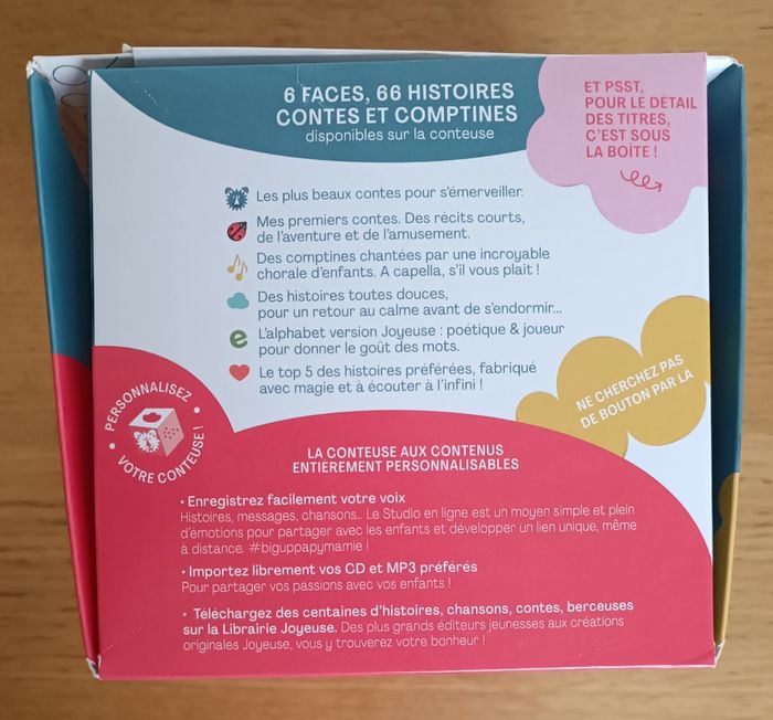 ⚠️Veuillez consulter mes autres articles, je suis en train de m’en débarrasser, mais je ne donne pas pour autant 😉 ⚠️ État : très bon état, pas d'imperfection majeure Vendue avec la boîte, la conteuse, le mode d'emploi et le câble de charge. Fabriquée en France Secouez-la 3 fois et c’est parti pour le plein d’émotions ! 66 histoires et comptines drôlement bien racontées et chantées par des voix complices. Pour s’évader, frissonner, danser, s’amuser avec les mots. Lot possible avec mes autres annonces. Envoi rapide (Mondial Relay) et soigné Ouvert à la négociation #conteuseahistoire #conteuse #histoire #comptine #bébé #bebe #enfant #2ans #2ansplus #joyeuse #seb310105 #merveilleuse